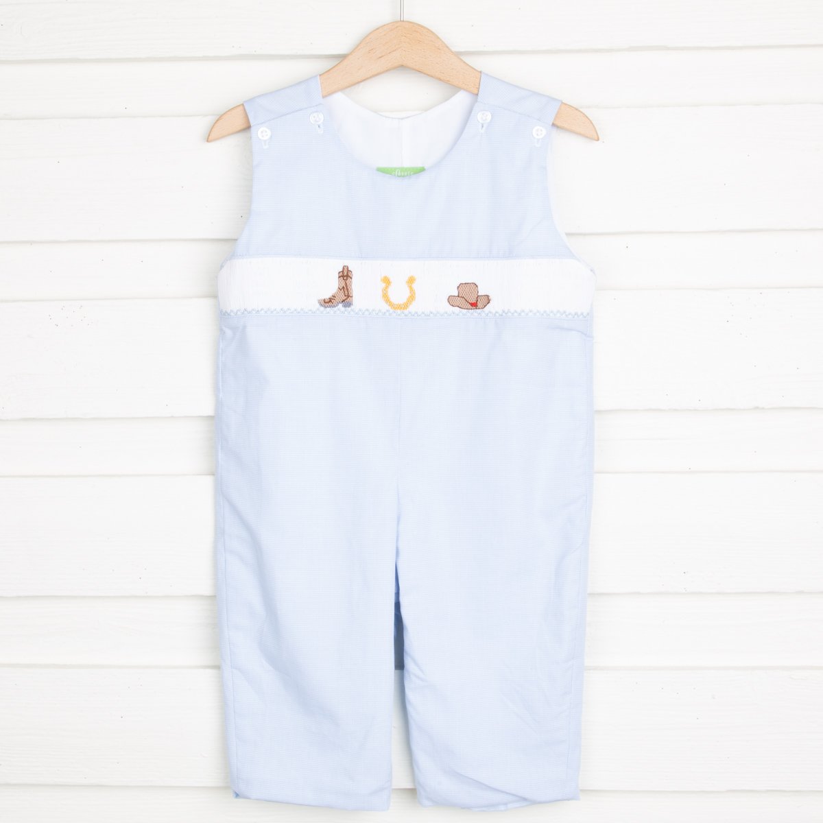 Hey y’all! Your little cowboy will be the cutest on the frontier in this Western Smocked Longall Light Blue Gingham! Featuring charming hand-smocked boots, a horseshoe, and a cowboy hat, this darling Jon Jon is perfect for rodeo days, themed parties, or just everyday twirling fun. Saddle up for some sweet western charm! Shoulder buttons and snaps in stride for easy changes.