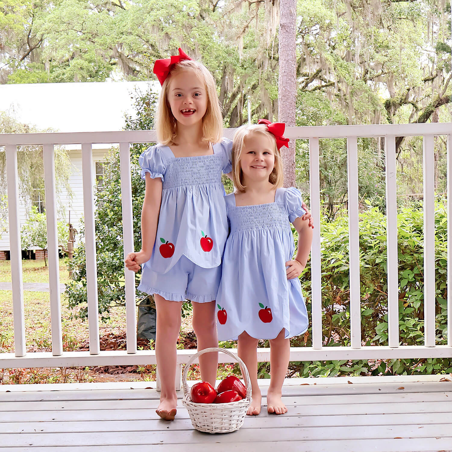 Perfect for back-to-school or a picnic day! This Hannah-style top in light blue features charming red apple appliqués and a scalloped bottom hem. The stretchable smocked bodice not only adds comfort but also accentuates the charming silhouette, complemented by adorable bishop sleeves. The set is coordinated with matching light blue ruffle shorts.