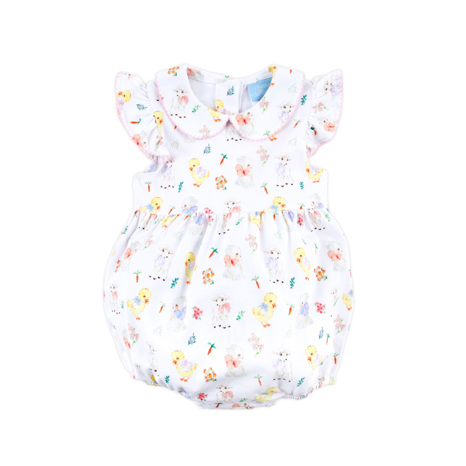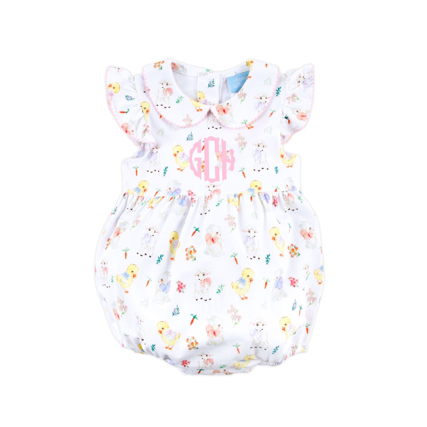 Hop into Easter fun with our Bunny & Friends Cleo Bubble! This sweet knit bubble features playful bunnies, cuddly lambs, and chirpy chicks, a cute collar, and fluttery sleeves trimmed with pink picot. Snaps in stride for easy changes. Add a monogram for an extra-special touch your little one will love!
