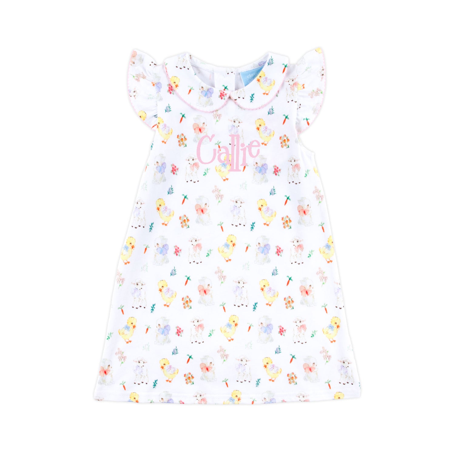 Hop into Easter fun with our Bunny & Friends Cleo Dress! This sweet knit dress features playful bunnies, cuddly lambs, and chirpy chicks, a cute collar, and fluttery sleeves trimmed with pink picot. Add a monogram for an extra-special touch your little one will love!