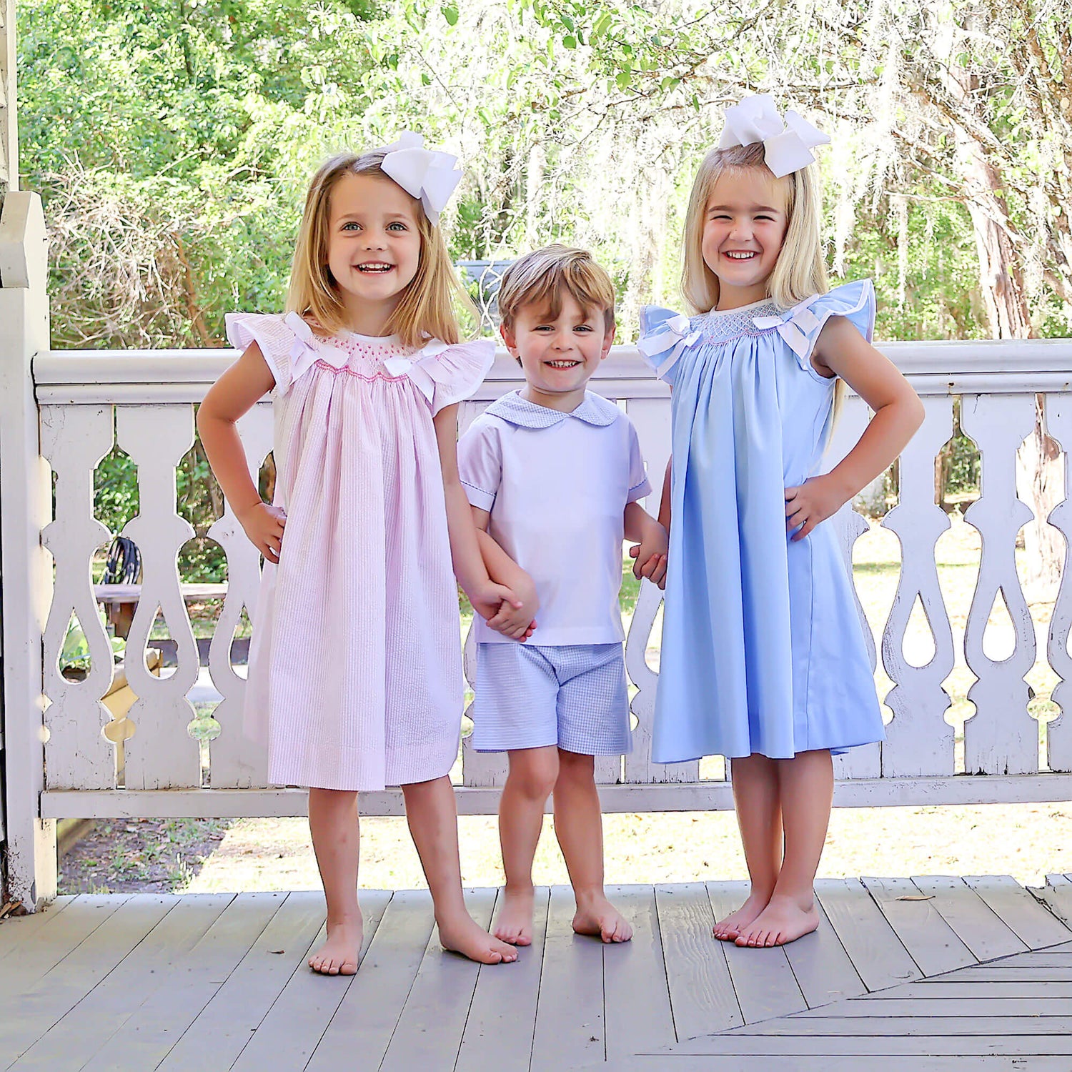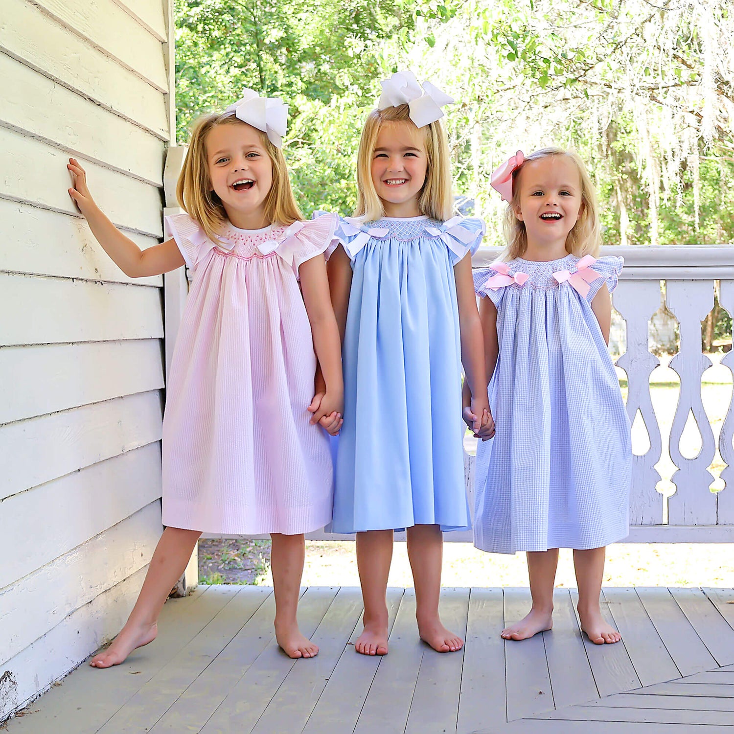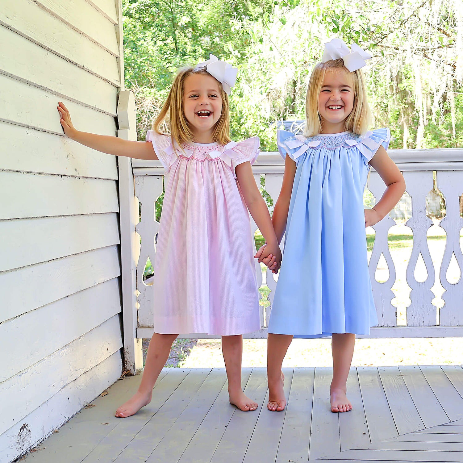 This Pretty In Pink Smocked Bow Dress is the sweetest spring outfit. Designed from light pink seersucker fabric, this dress features delicate geometric hand-smocking and is adorned with white satin bows. It features angel-style sleeves with white tape trim, adding to its charm.