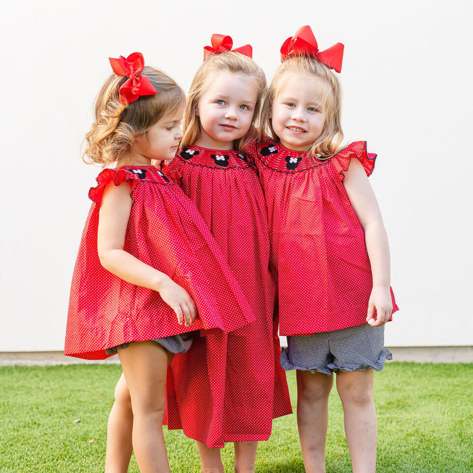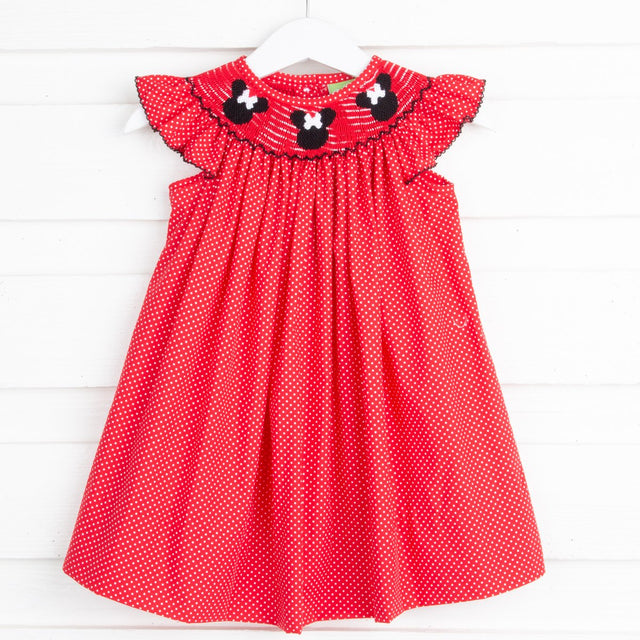 A little extra pixie dust went into creating this dress! Smocked with mouse ears and bow designs, this red and white polka dot look is so fun for any occasion! Angel sleeve.