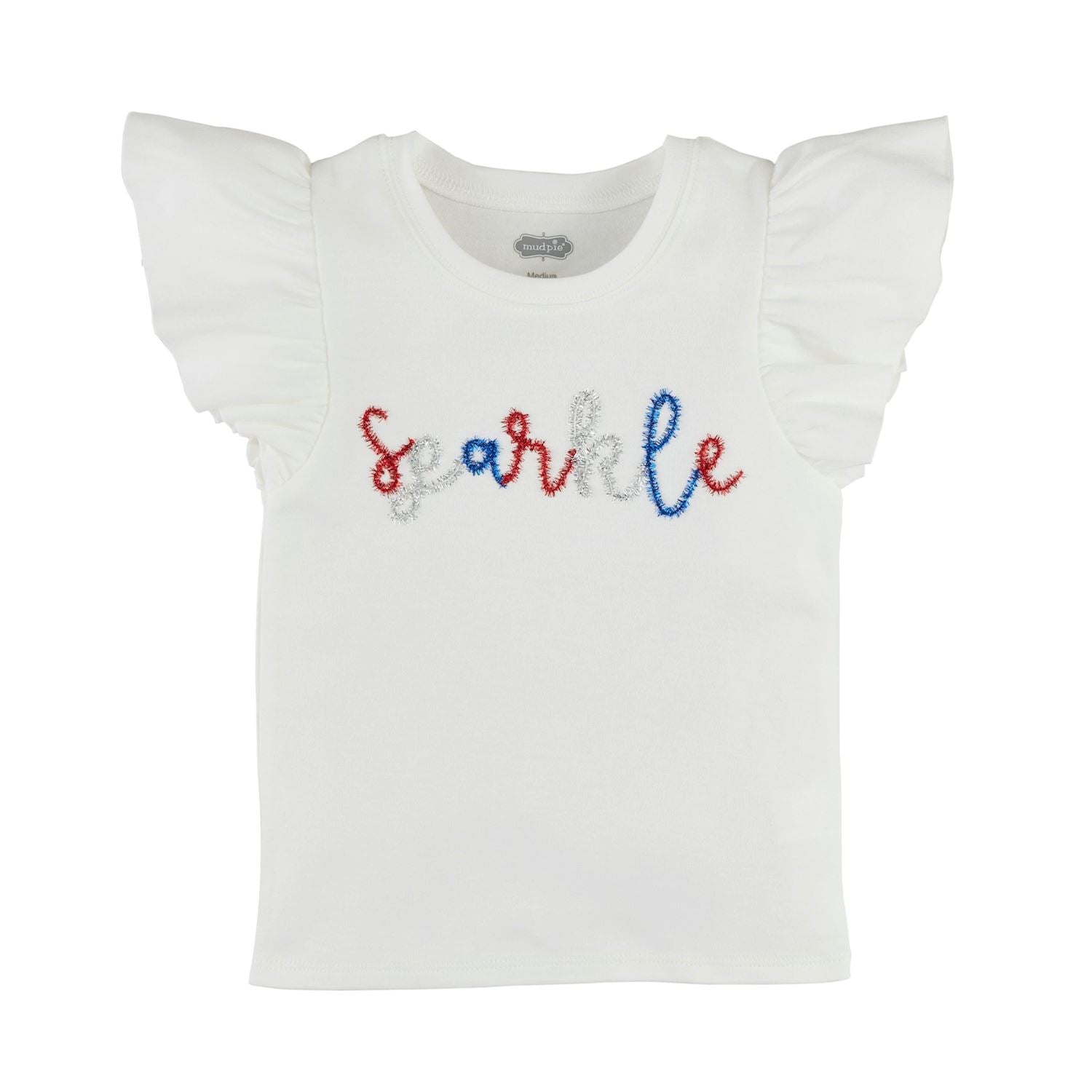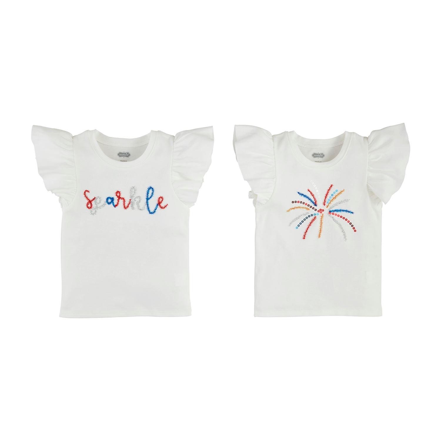 Celebrate Independence Day in style with this adorable 4th of July Girls' Toddler Tee. Crafted from soft and breathable 100% cotton interlock fabric, this charming tee ensures comfort for your little one throughout the day. The flutter sleeves add a playful touch, perfect for festive occasions. The front of the tee is adorned with a delightful tinsel and sequin appliqué, adding a sparkling element that captures the spirit of the holiday.