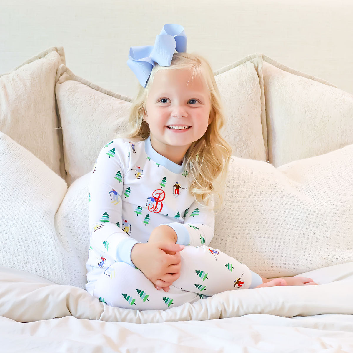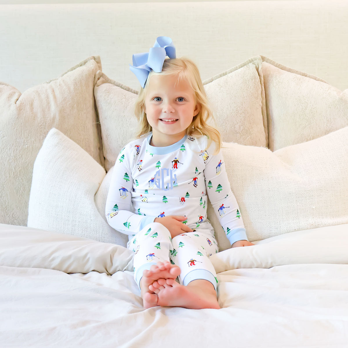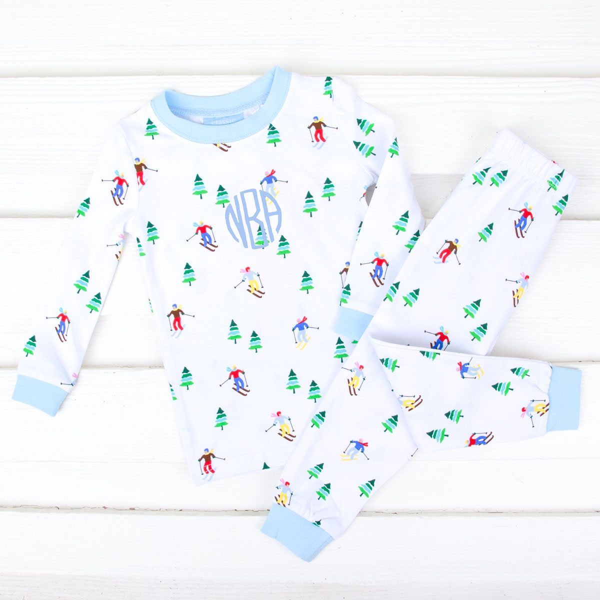 Get ready for bedtime in the cutest Ski Slope Pajamas! These long pajamas feature a fun ski print, a long sleeve pajama top, and matching bottoms with light blue ribbing. Soft and snuggle-ready, these PJs can be personalized with a monogram for an extra special touch. Don't miss the matching ladies' style for mom or coordinate with siblings!