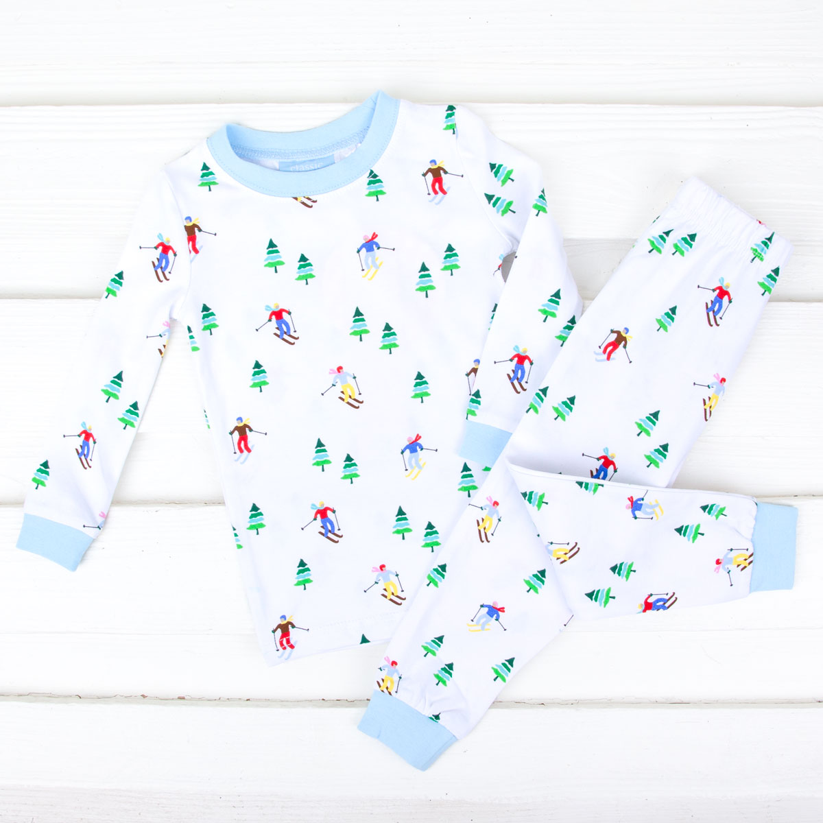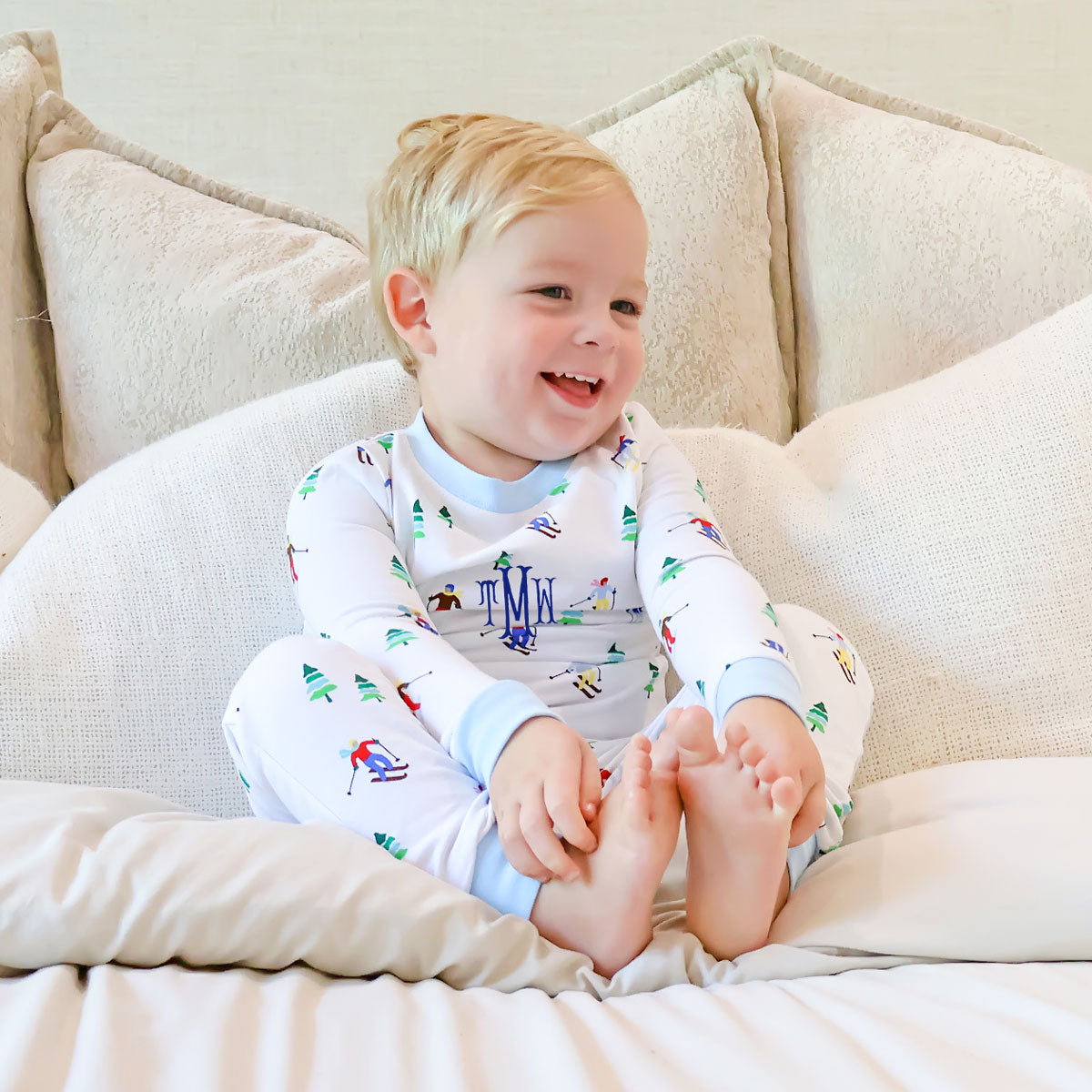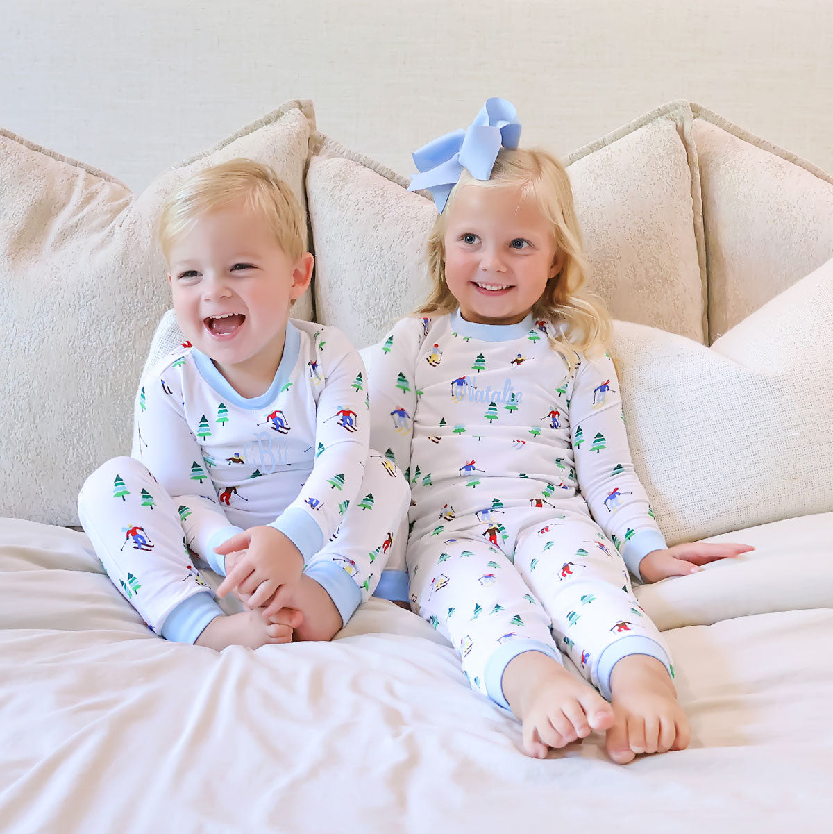 Get ready for bedtime in the cutest Ski Slope Pajamas! These long pajamas feature a fun ski print, a long sleeve pajama top, and matching bottoms with light blue ribbing. Soft and snuggle-ready, these PJs can be personalized with a monogram for an extra special touch. Don't miss the matching ladies' style for mom or coordinate with siblings!