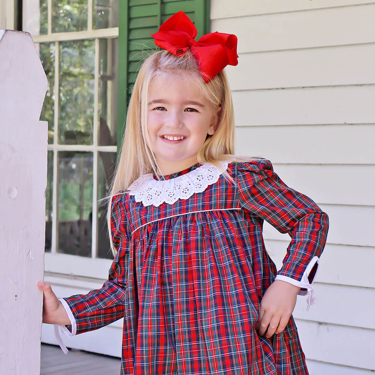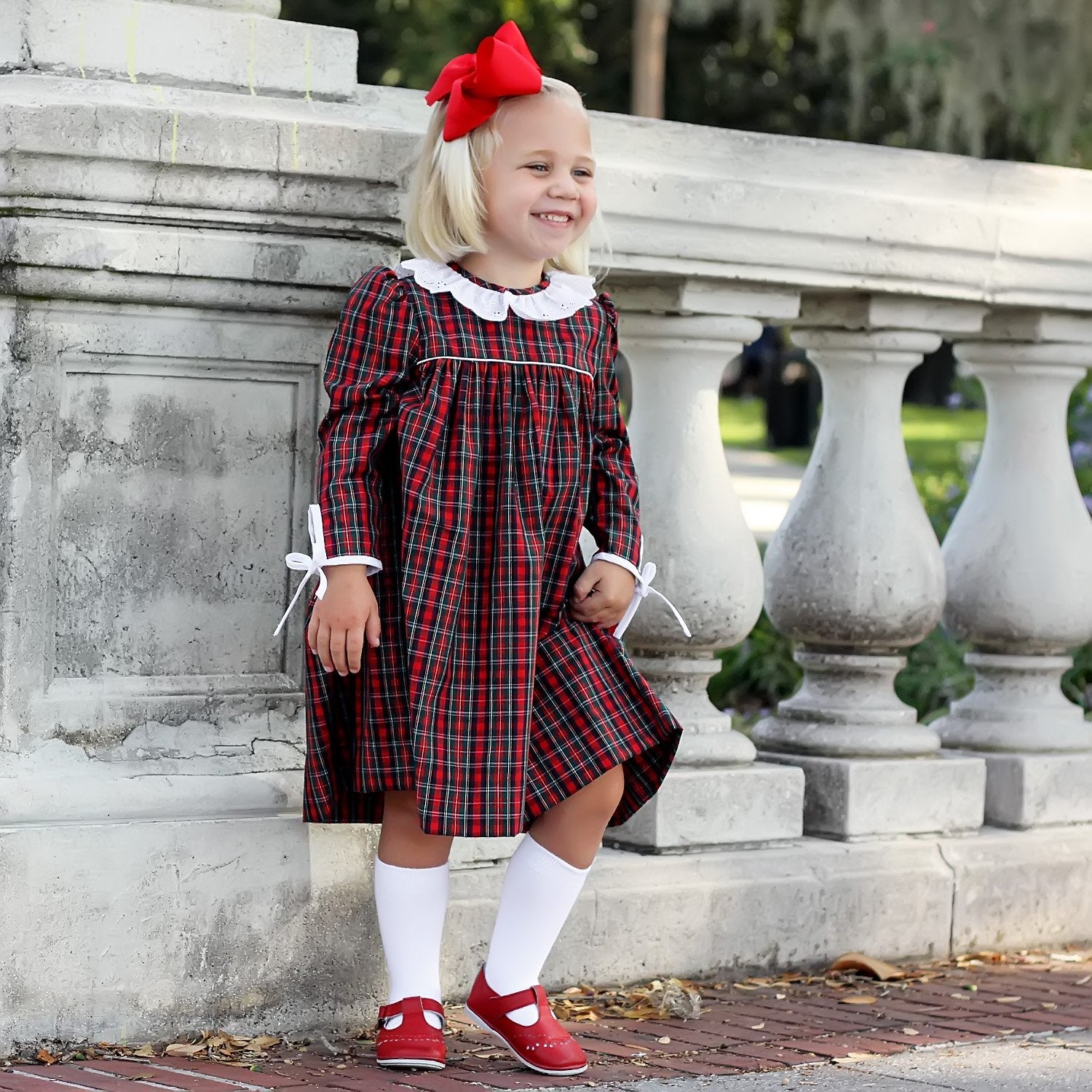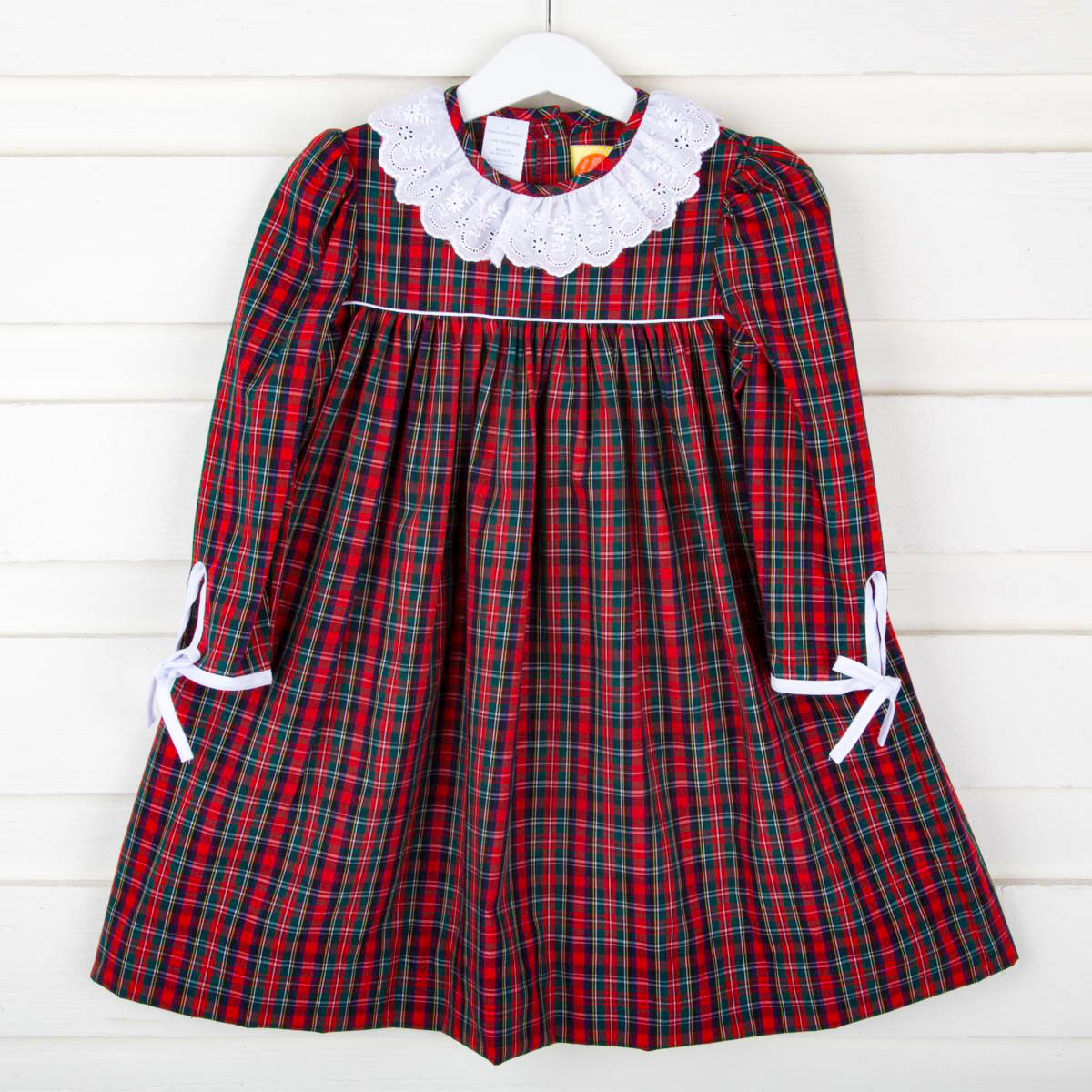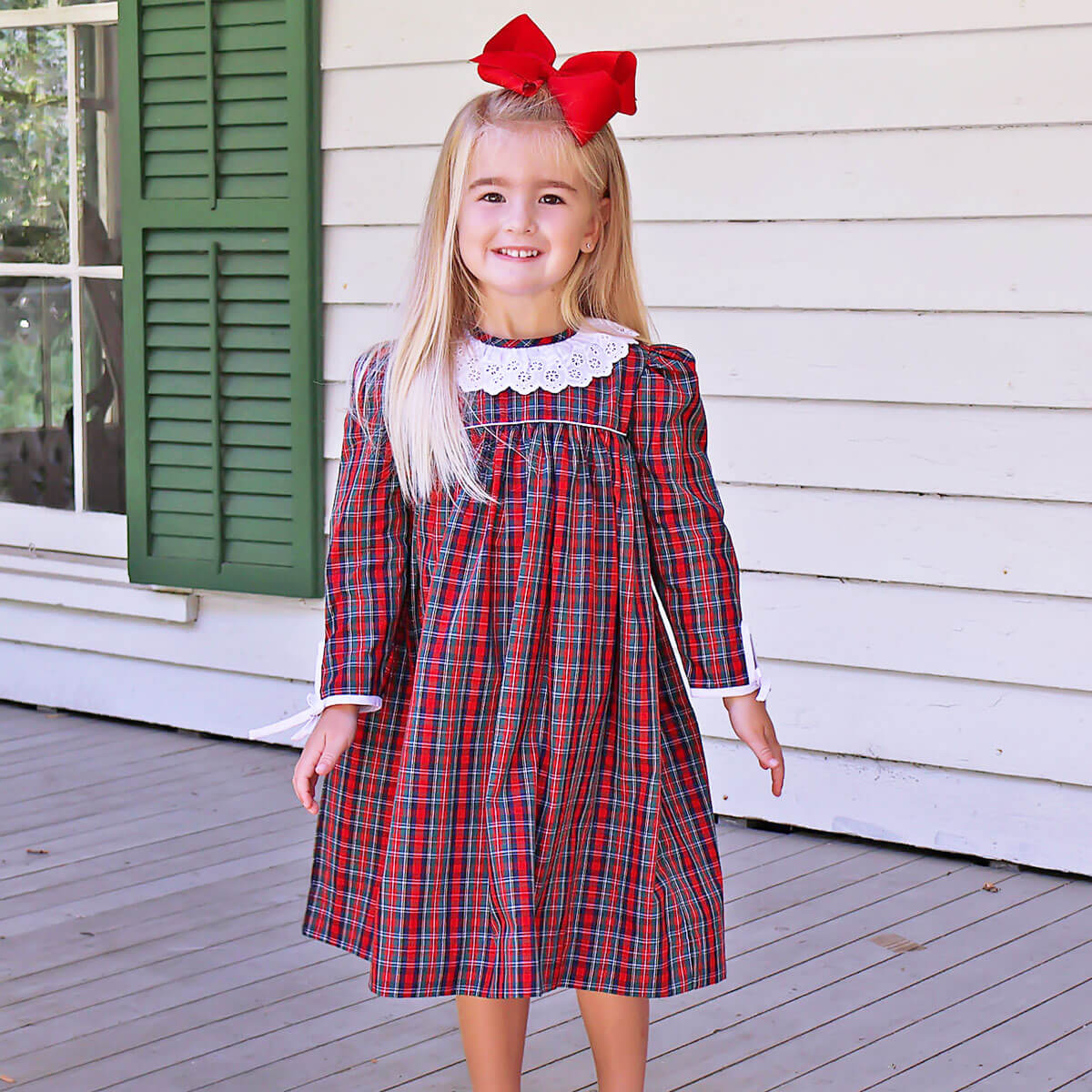 Get ready for the holidays with our Christmas Eve Plaid Virginia Dress! This charming red plaid dress features a cute white eyelet collar and long sleeves, ensuring festive style.