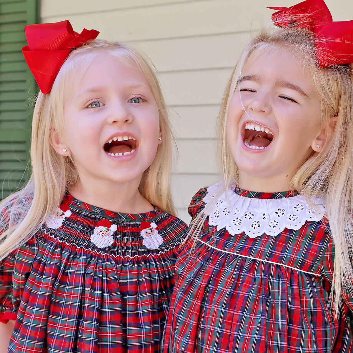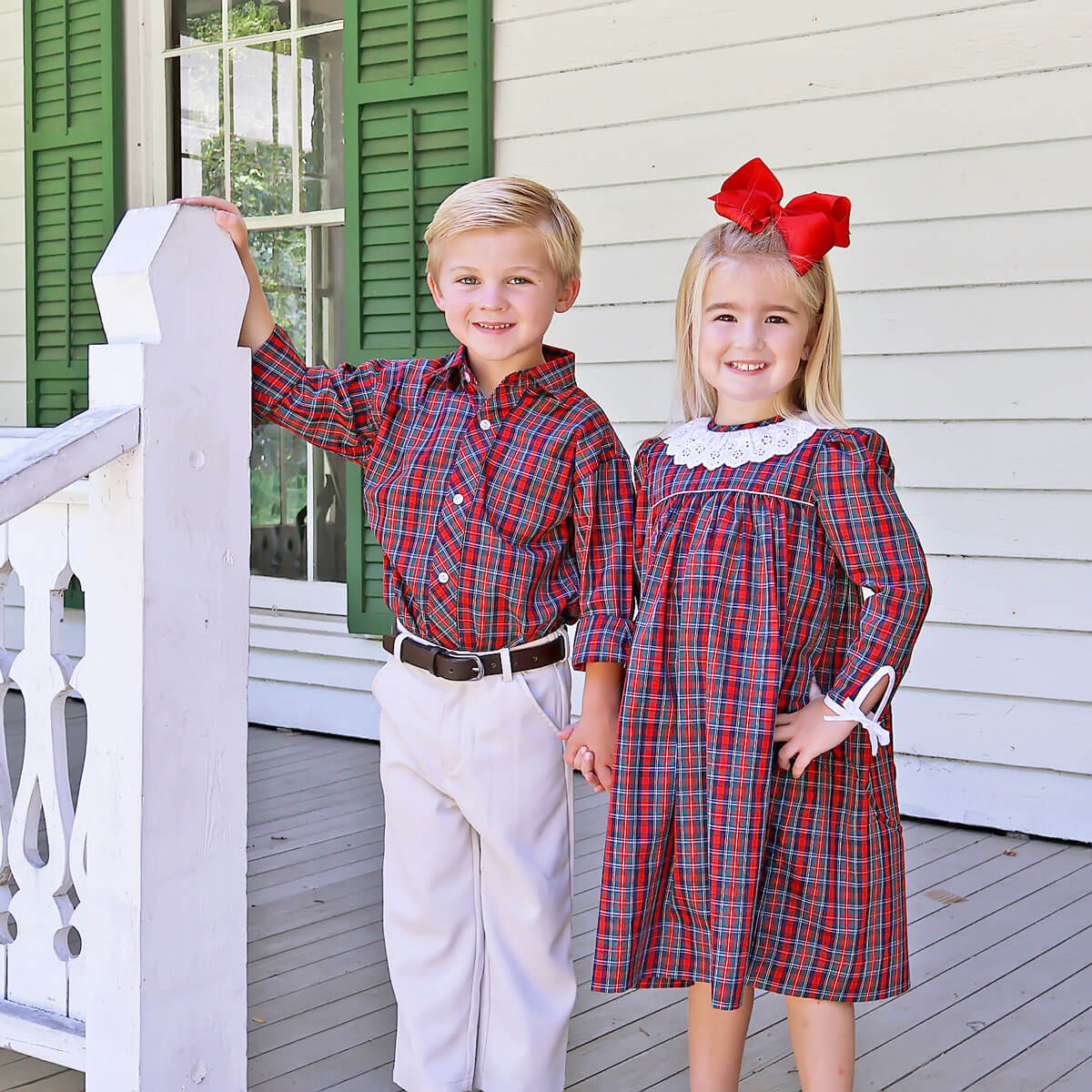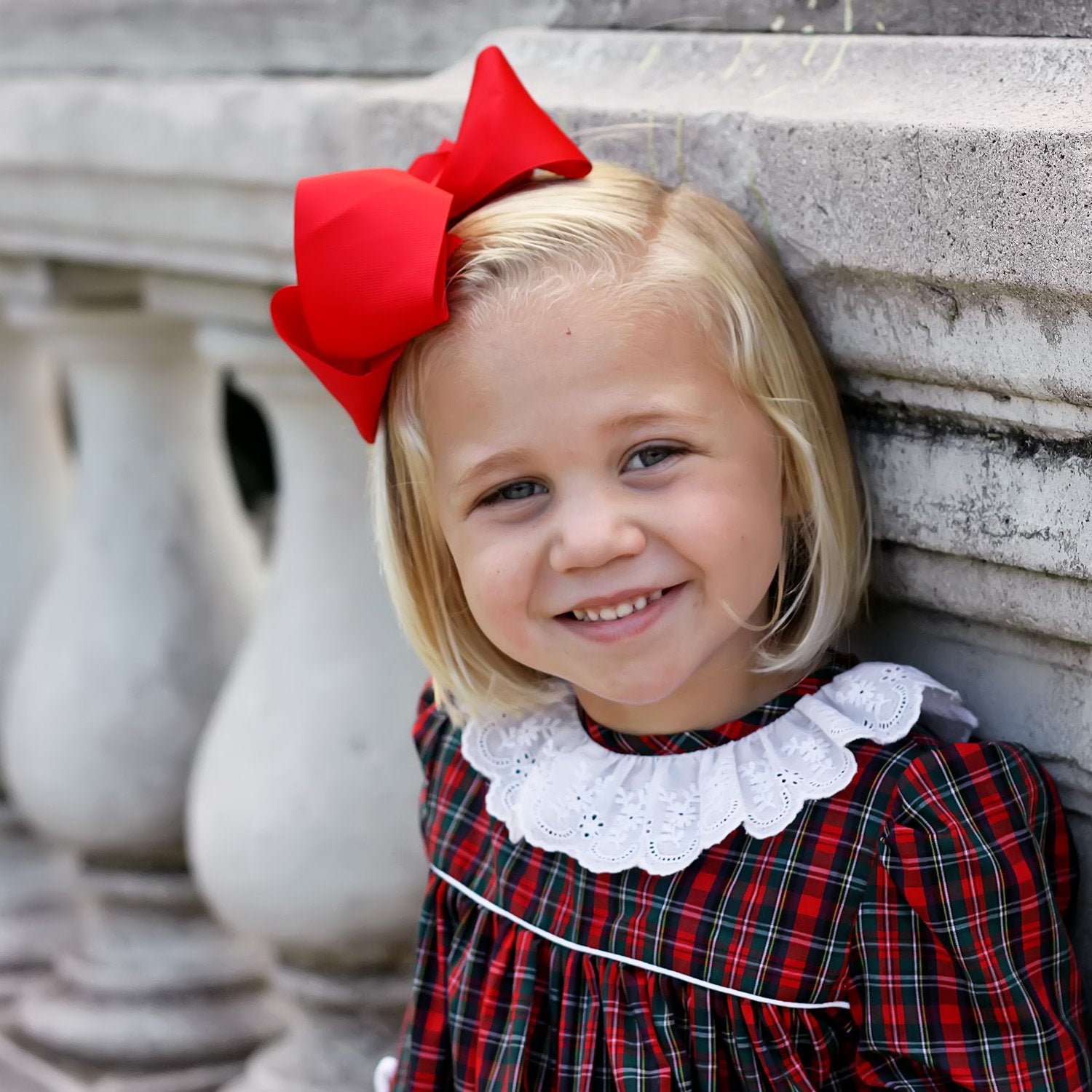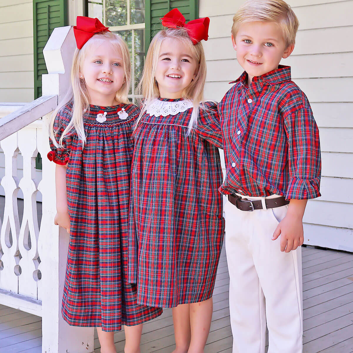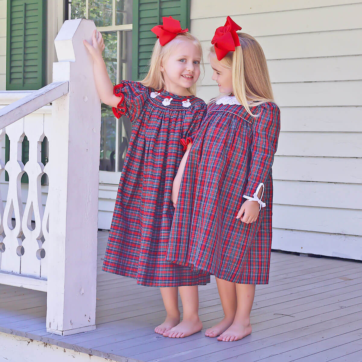 Get ready for the holidays with our Christmas Eve Plaid Virginia Dress! This charming red plaid dress features a cute white eyelet collar and long sleeves, ensuring festive style.