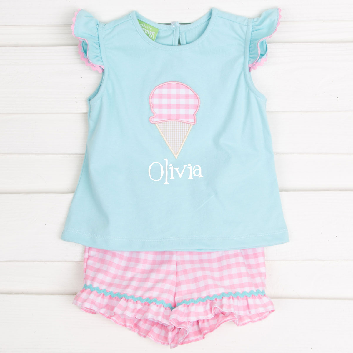 This aqua and pink set is so cute for the Summer! We created the most adorable ice cream applique that coordinates with a knit top and gingham shorts.