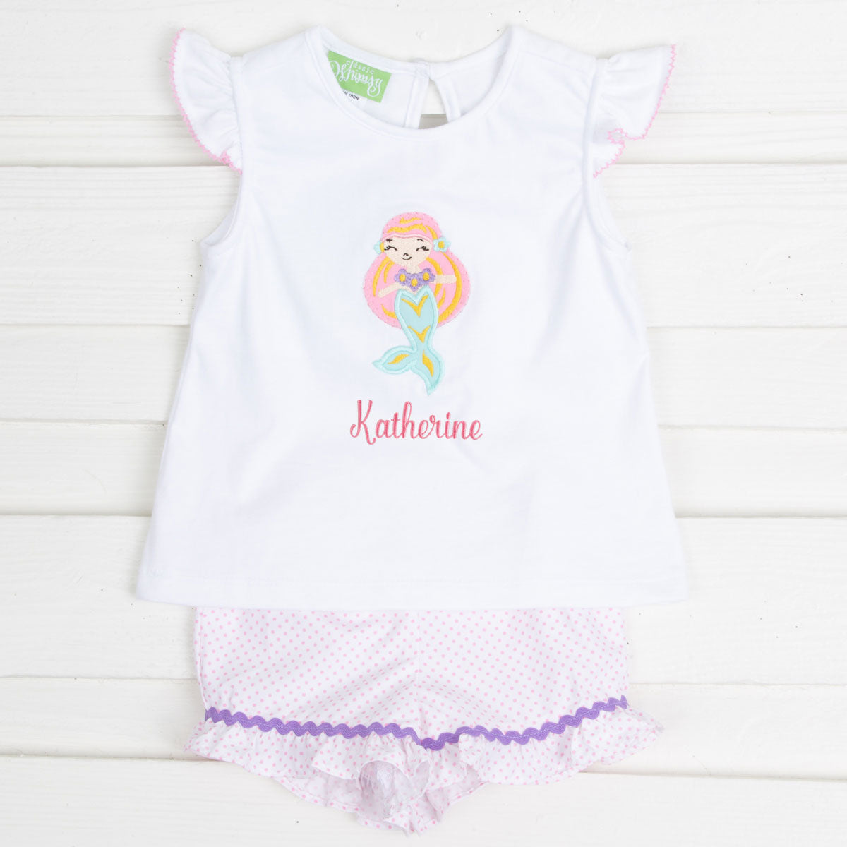 This pink knit set is playdate perfect! We added lavender details to coordinate with the adorable mermaid applique.