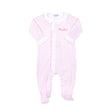 The sweetest baby sleeper with feet made from the softest pima cotton. Pink includes a soft ruffle trim. Coordinates with other items in the Mini Checks Collection from Magnolia Baby.