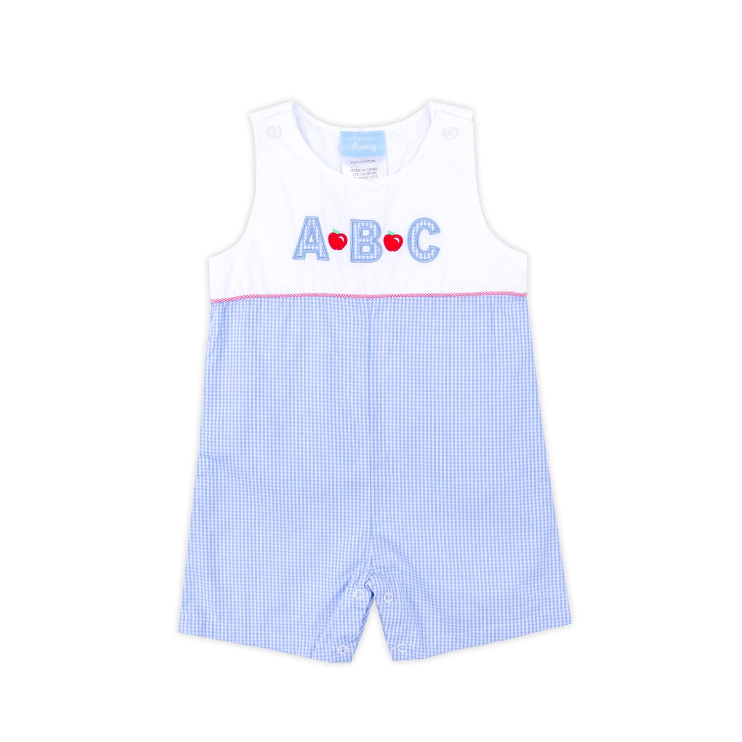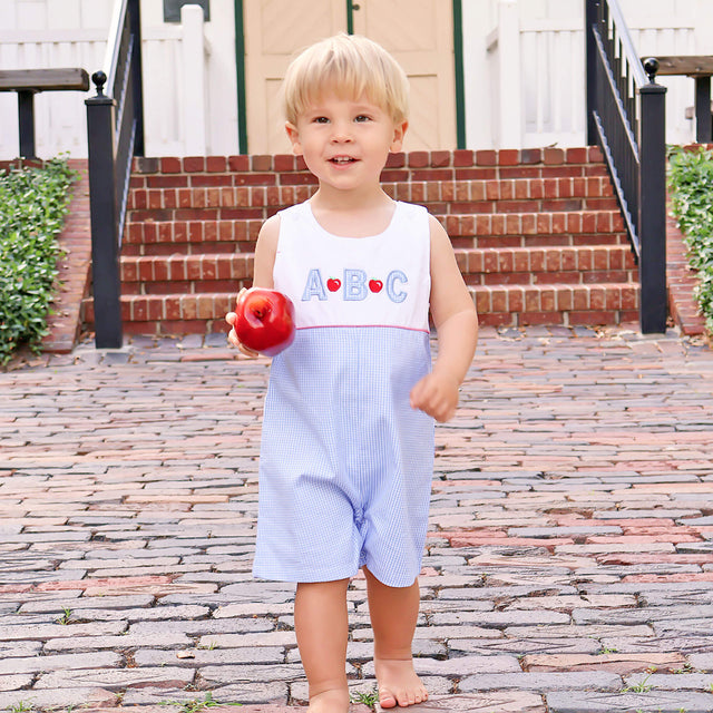 This sweet Apple & ABC Light Blue Gingham Jon Jon is the perfect outfit for school days! The charming light blue gingham Jon Jon features a fun ABC applique. It’s a playful and stylish choice for your little one’s back-to-school adventures! Shoulder buttons and snaps in stride for easy changes. Add a monogram for a personalized touch!