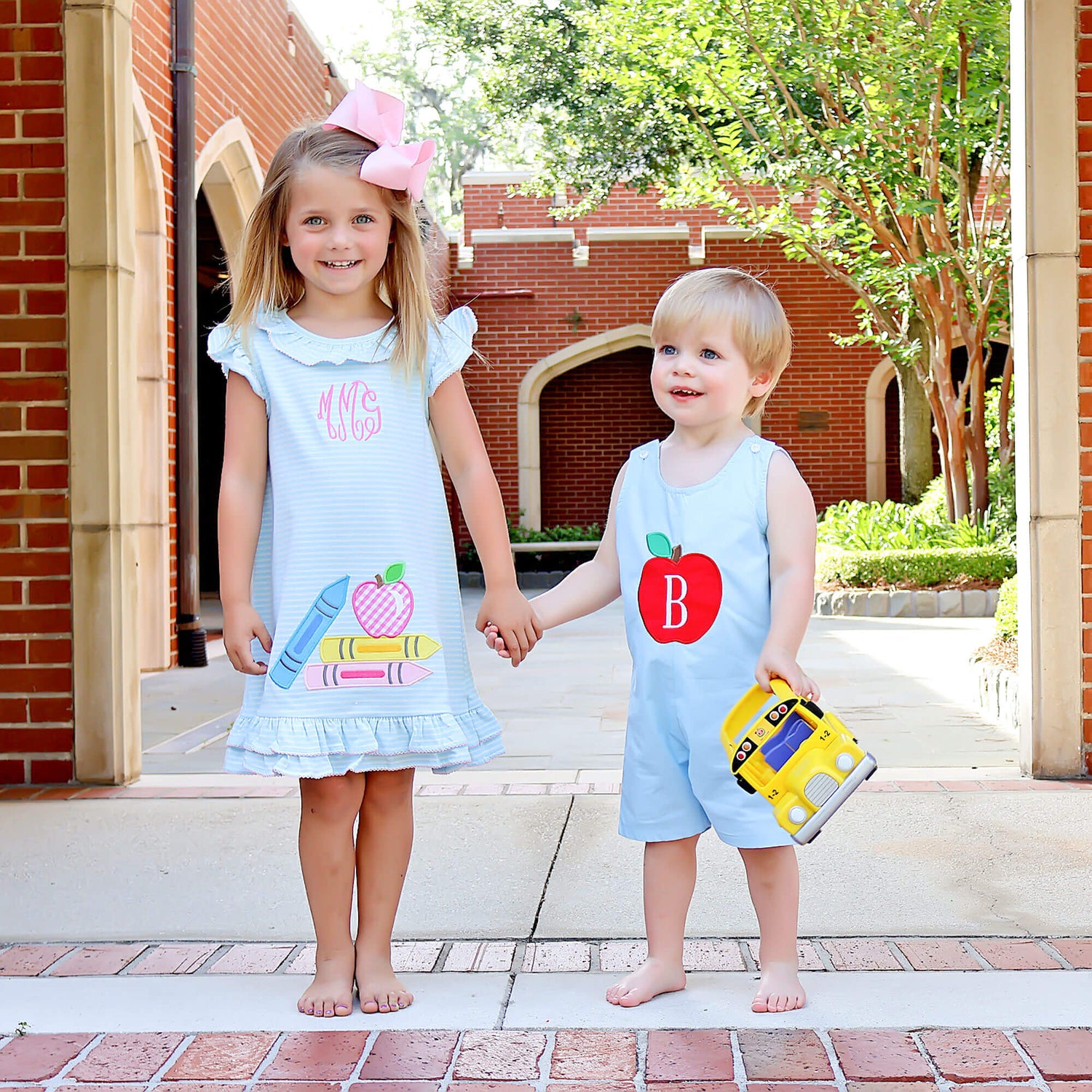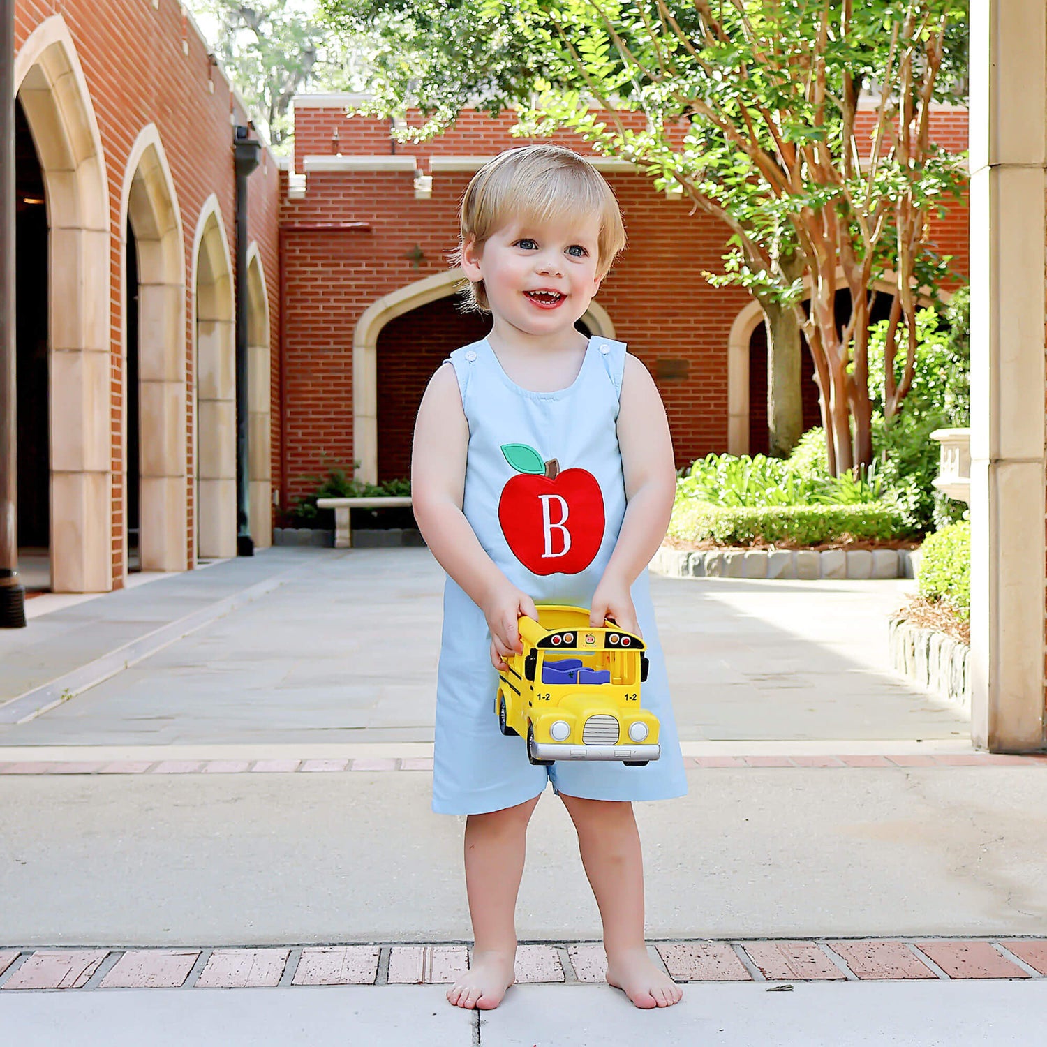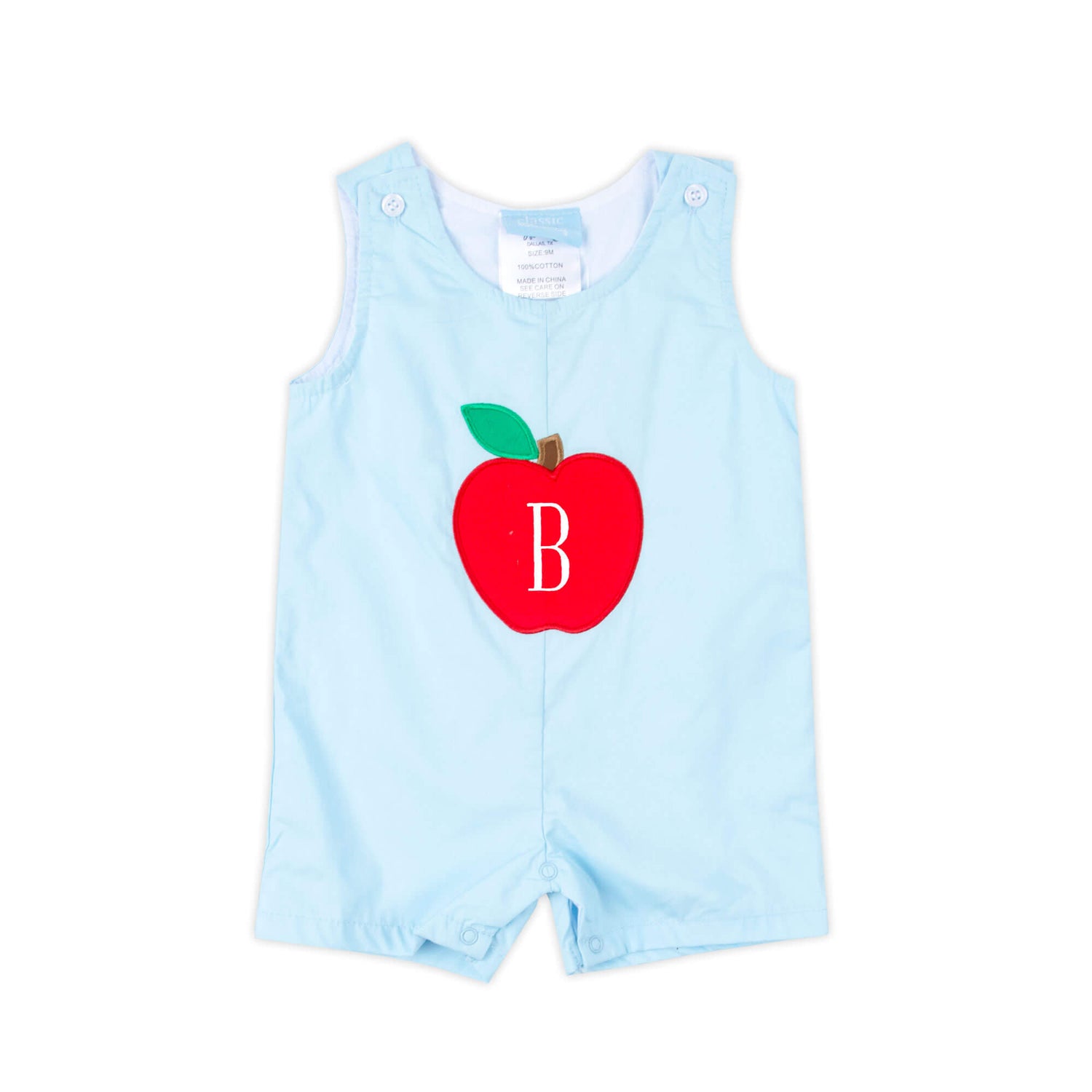 Your little one will be excited to start school in this adorable Apple Light Blue Jon Jon! Featuring a classic red apple appliqué, this light blue Jon Jon is perfect for the first day of school. Designed with shoulder buttons and snaps in stride for easy changes. Add a monogram for a personalized touch!