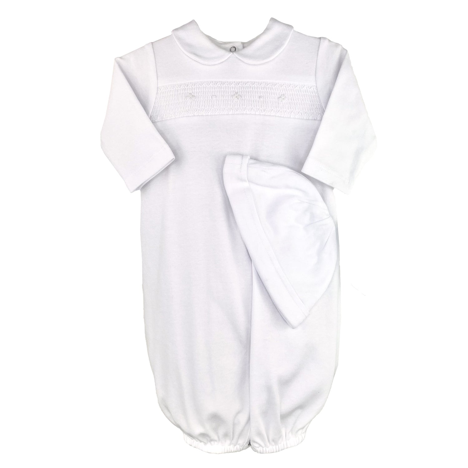 Featuring delicate smocking that is perfect for babies. Comes in a soft blue or white fabric with a sweet white Peter Pan collar. This 100% cotton knit gown converts with snaps into a romper for two outfits in one. A matching hat is also included.