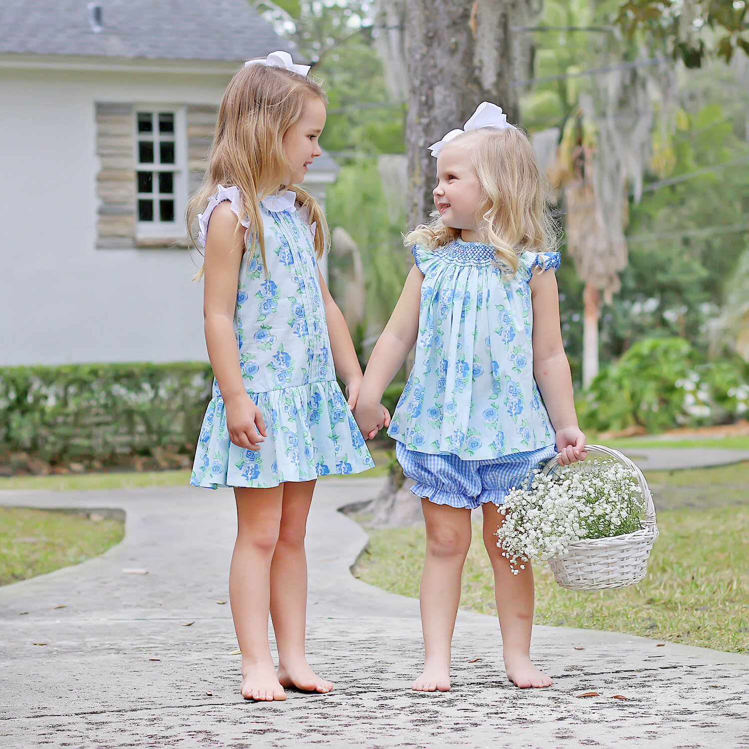 Prepare for Easter or any special occasion this spring with the Happy Spring Floral Smocked Bloomer Set. This charming blue floral print top features geometric smocking, adding a delightful touch to the outfit. Sweet flutter sleeves with blue trim enhance the overall appeal, making it a perfect choice for your little one's festive wardrobe. The set includes blue gingham bloomers.