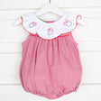 This adorable hand-embroidered Mouse Ears Quinn Bubble is a must for your baby or toddler girl's next fairytale vacation! Classic red gingham bubble outfit with scallop collared neckline featuring darling shadow embroidered mouse ears with that quintessential red bow! Snaps in stride.