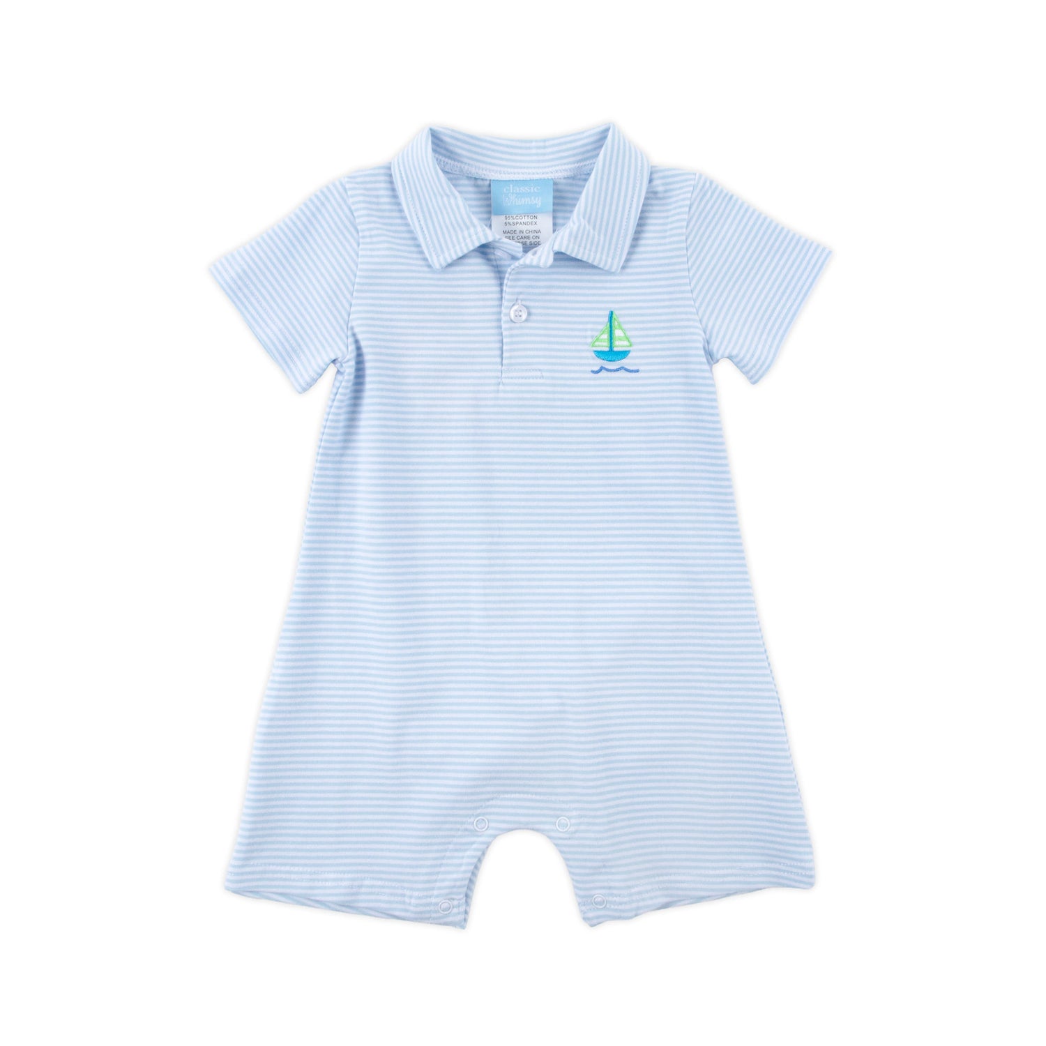 Set sail for summer fun in our Nautical Adventure Light Blue Stripe Polo Romper! This short-sleeve stripe knit romper features a charming embroidered sailboat for a classic seaside look. Snaps in the stride make changes easy, and you can add a monogram to personalize this sweet outfit!