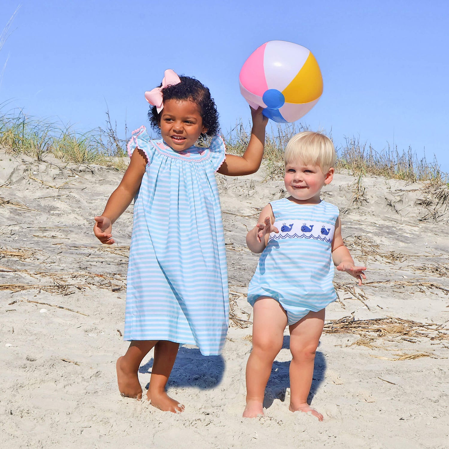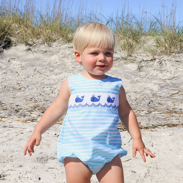 The Pacific Whale Smocked Mint Stripe Sun Bubble is the perfect summer outfit for seaside days and sunny adventures. Designed in fresh mint stripes with sweet hand-smocked whales, this charming bubble captures a playful seaside look. Shoulder buttons and snaps at the stride make diaper changes quick and easy.