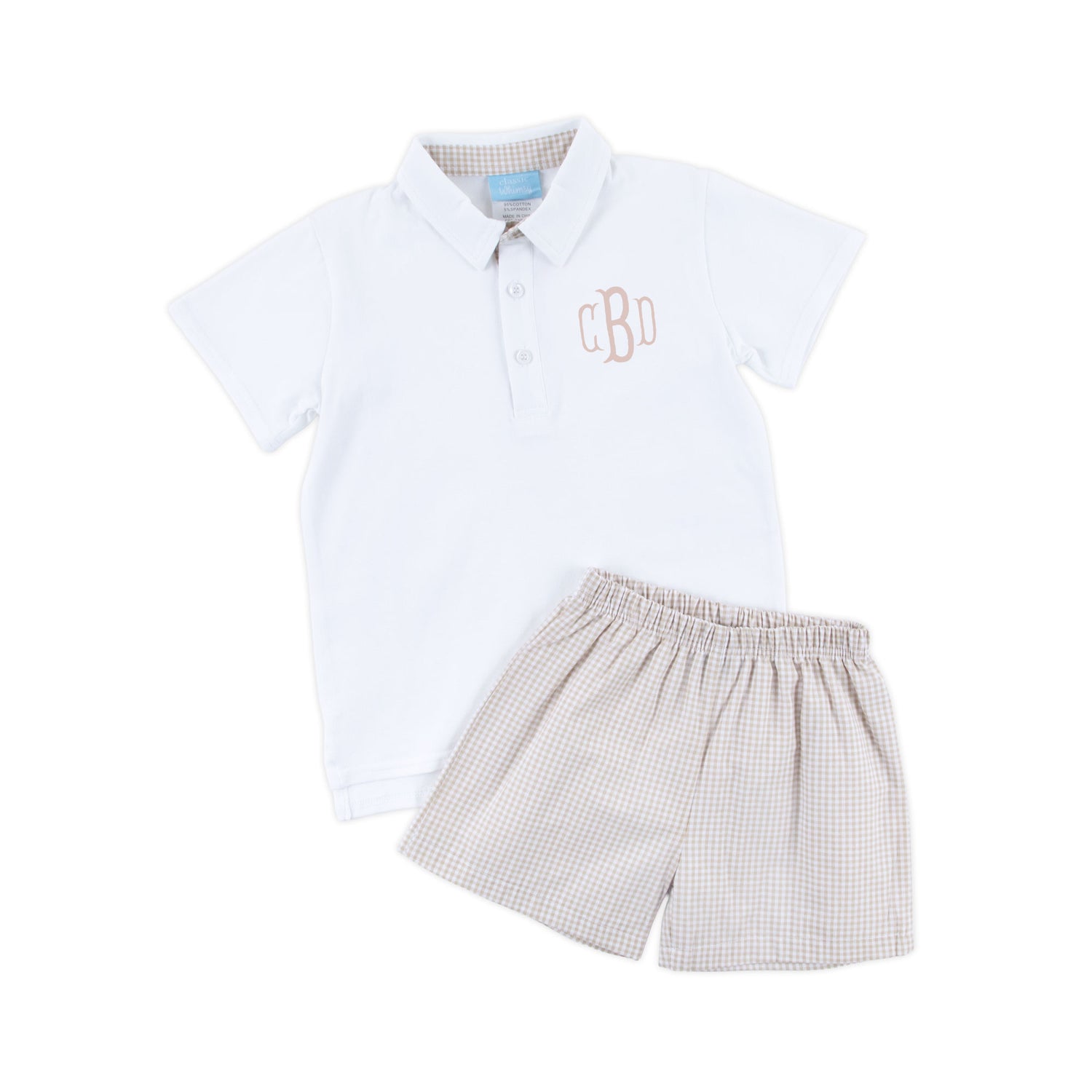 Style your little cutie pie with elegance in our Tan Gingham Polo Short Set. The white knit polo features a delightful touch of tan gingham on the inner lining tab, enhancing its classic appeal. The set is completed with matching tan gingham shorts. Easily coordinate with mom and siblings by selecting an outfit from the Tan Gingham Mom & Me collection. Consider adding a monogram to personalize this delightful outfit.