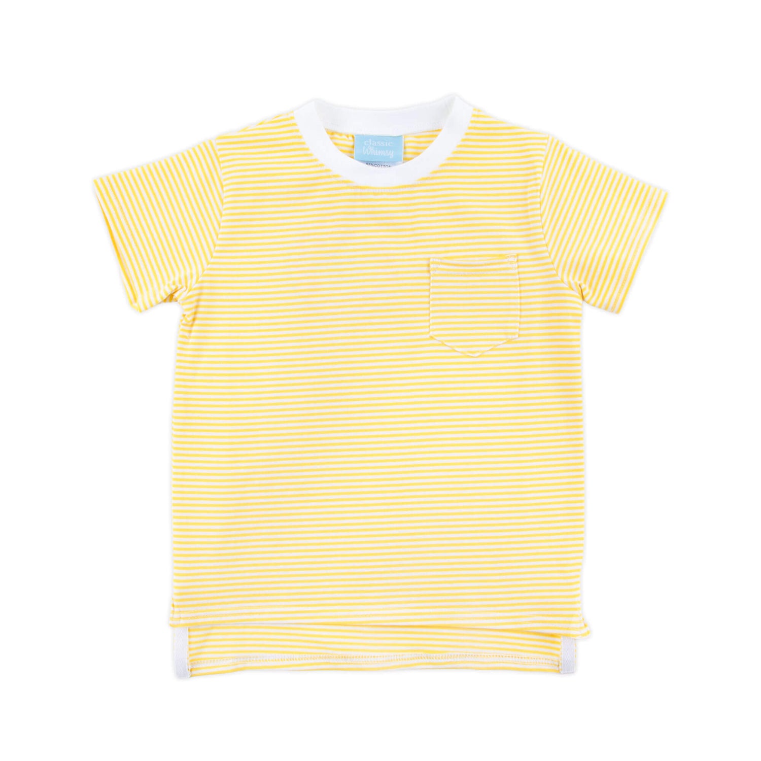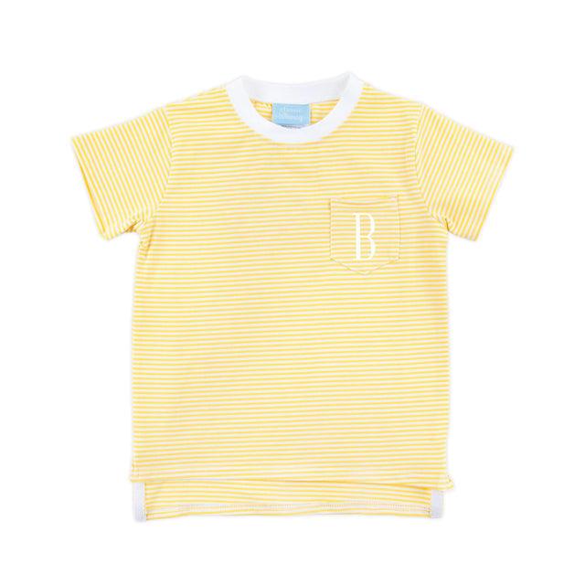 Add this Yellow Stripe Short Sleeve Pocket Shirt to your little boy's wardrobe for a versatile and stylish staple. This short sleeve t-shirt features timeless style and includes a convenient side pocket, allowing you to mix and match effortlessly with your favorite bottoms. It's great for school, playdates, family outings, or casual everyday wear, bringing a playful and polished touch to any occasion. Personalize it with a monogram to make it uniquely his and add an extra special detail to his outfit.