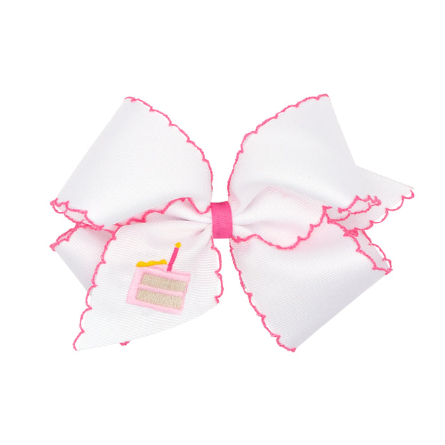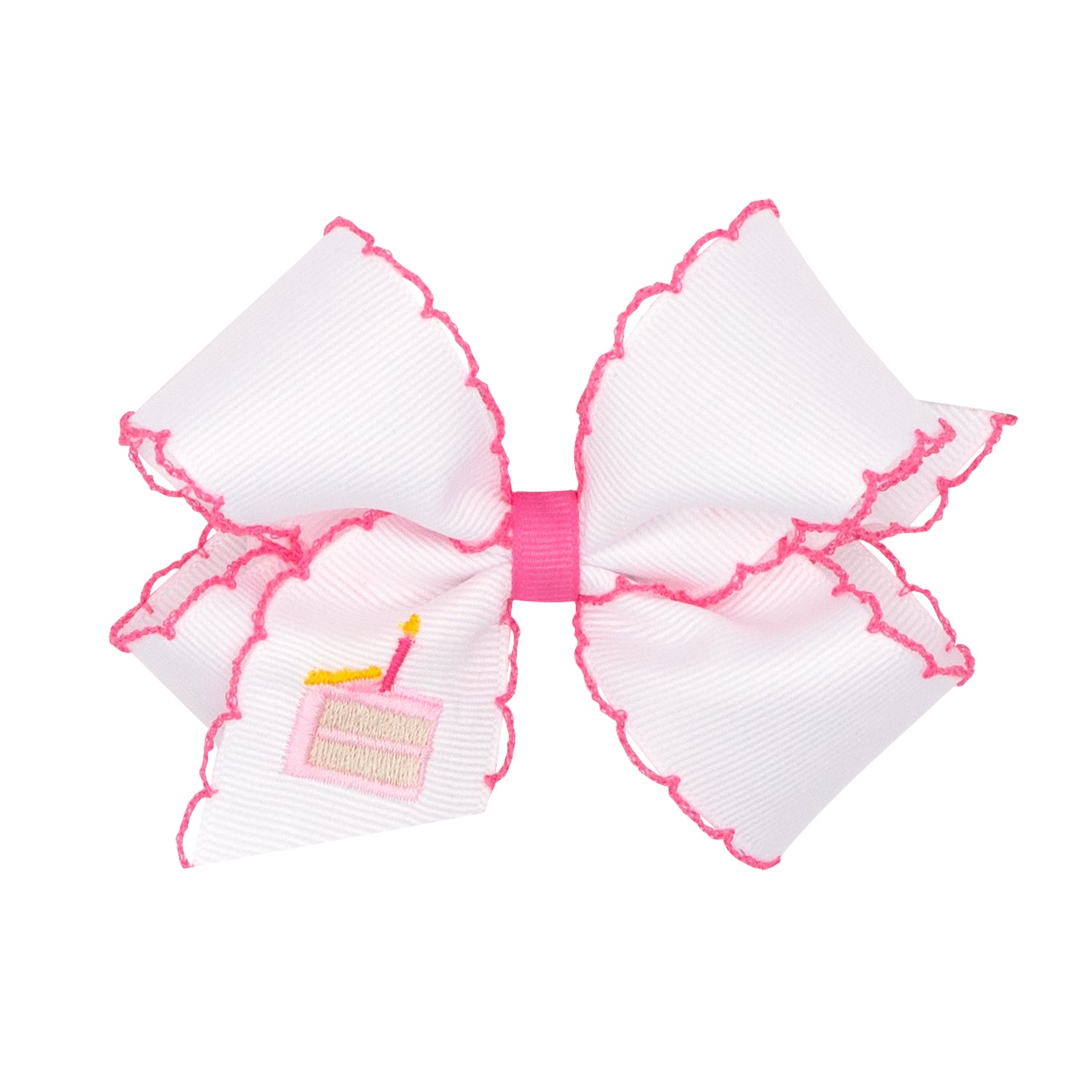 Let the birthday girl show off her status with this adorable moonstitch bow that's adorned with a special birthday cake on the tail. This hair bow for girls is sure to stay in her hair all day with our patented WeeStay™ no-slip hair clip