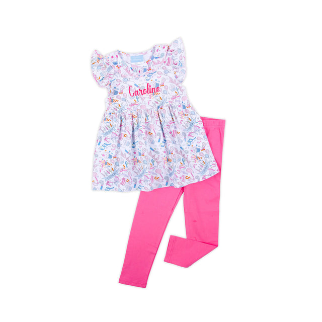 Celebrate a big birthday in our adorable Birthday Girl Ruffle Collared Legging Set! This charming knit top features a festive birthday-themed print, playful fluttered sleeves, and a darling ruffle collar with pink picot trim. Paired with pink leggings, making it the perfect choice for a fun and stylish party outfit. Add a personalized monogram to make it uniquely yours!