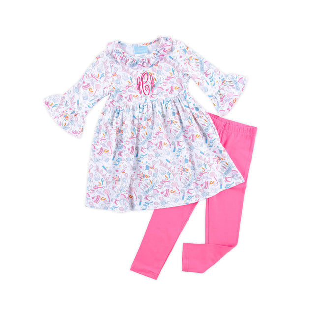 Celebrate a big birthday in our adorable Birthday Girl Ruffle Collared Long Sleeve Legging Set! This charming knit top features a festive birthday-themed print, playful long bishop sleeves, and a darling ruffle collar with pink picot trim. Paired with pink leggings, making it the perfect choice for a fun and stylish party outfit. Add a personalized monogram to make it uniquely yours!
