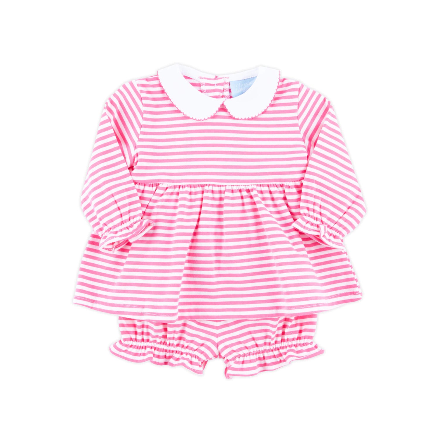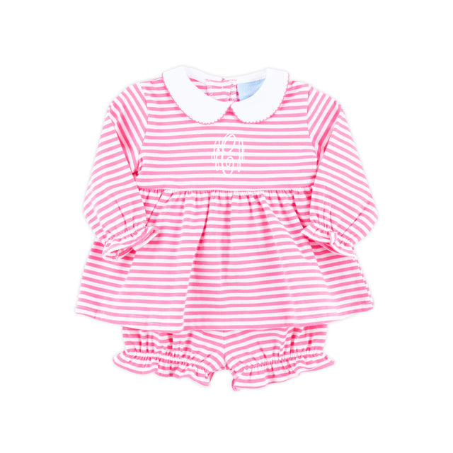 Your little girl will adore wearing the Hot Pink Stripe Riley Bloomer Set! The Riley-style top, designed in a pink stripe knit print, features a charming white collar with pink picot trim, and long bishop sleeves. Paired with matching pink stripe bloomers, this set is as sweet as can be. Add a monogram for an extra-special touch. It's the perfect outfit for any sweet adventure!