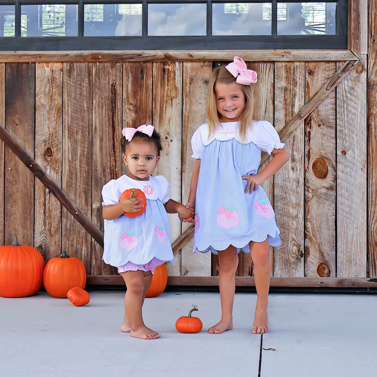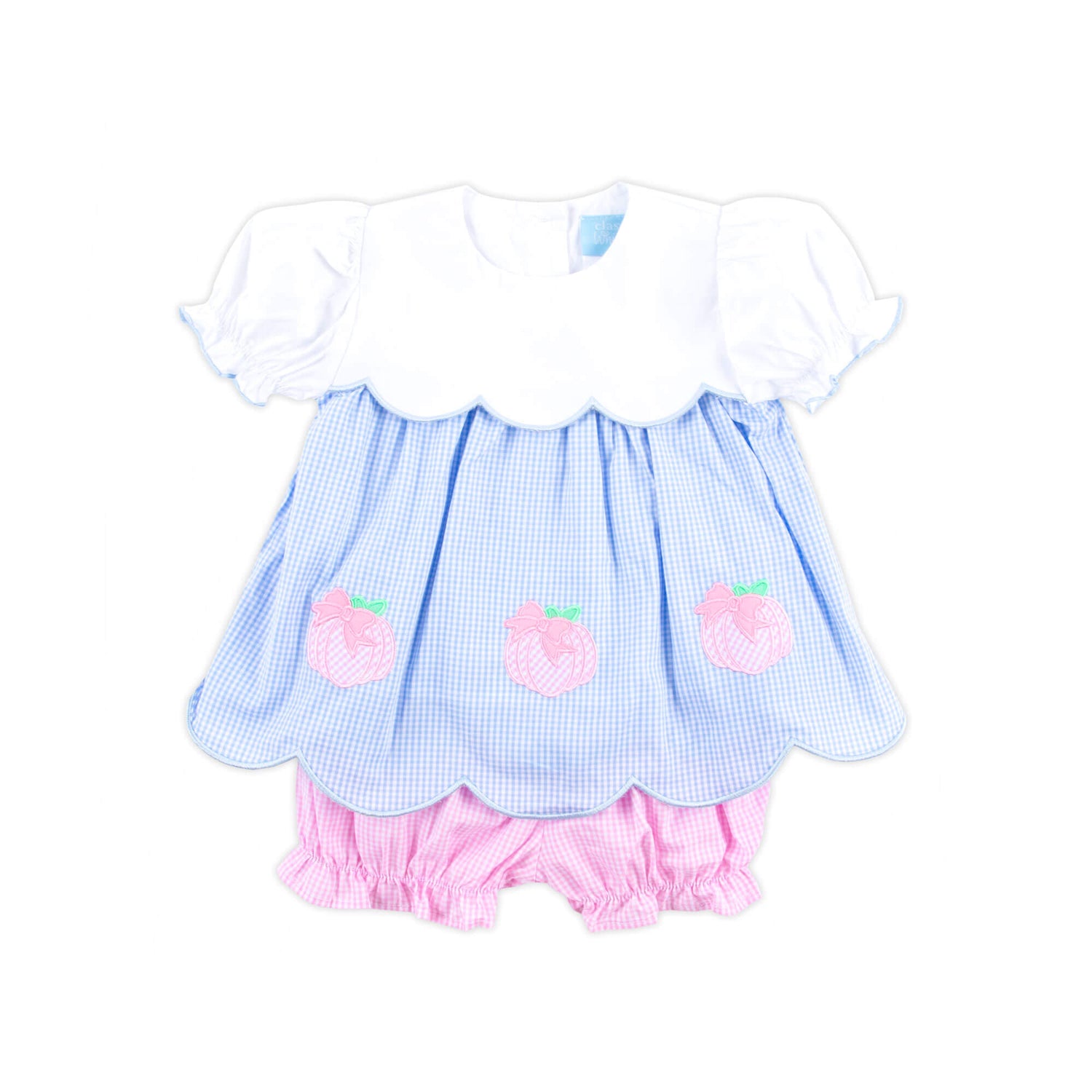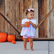 Your sweetie will love pumpkin patch adventures in the Sweet Pumpkin Bow Light Blue Gingham Amelia Bloomer Set! This light blue gingham top features adorable pumpkin appliqués and a scalloped hem, perfectly paired with pink gingham bloomers. Add a monogram for a personalized touch!