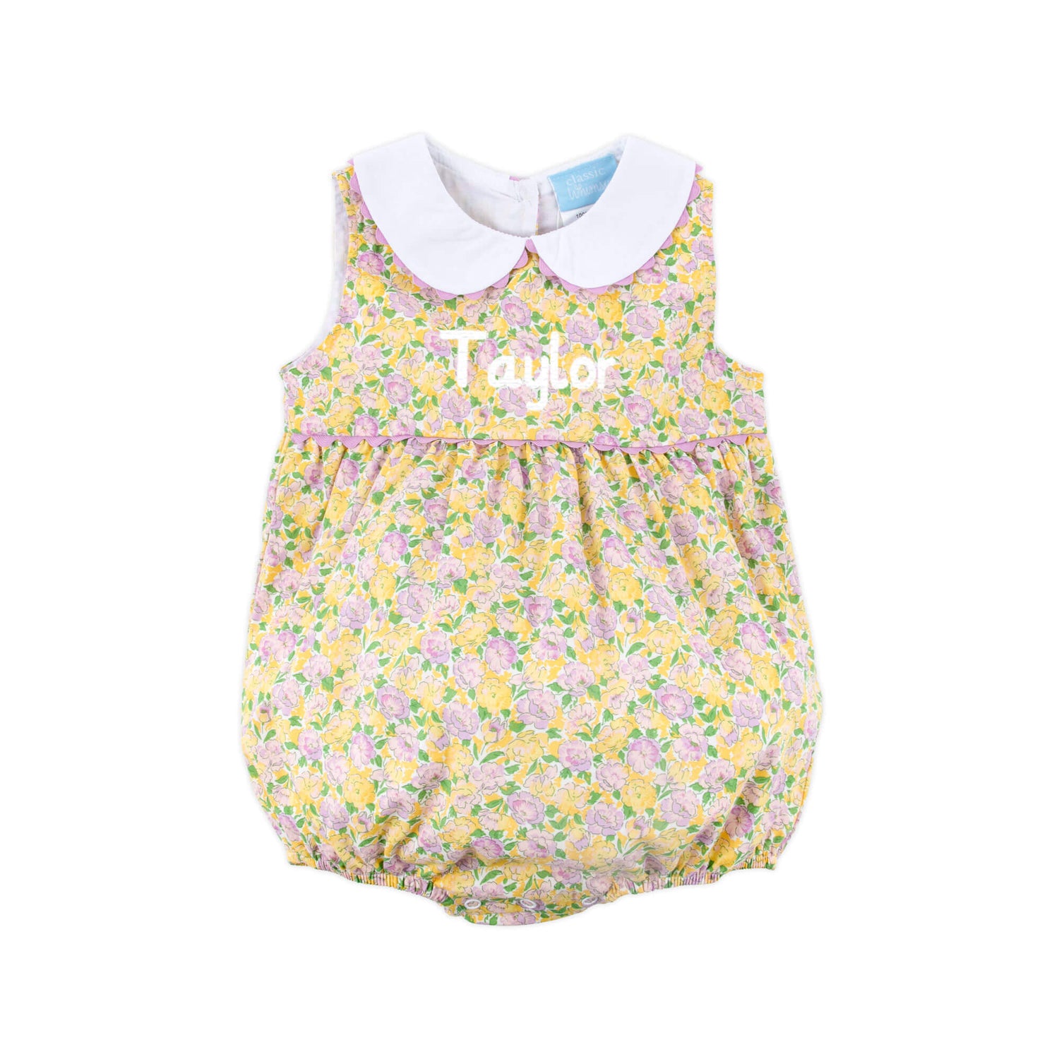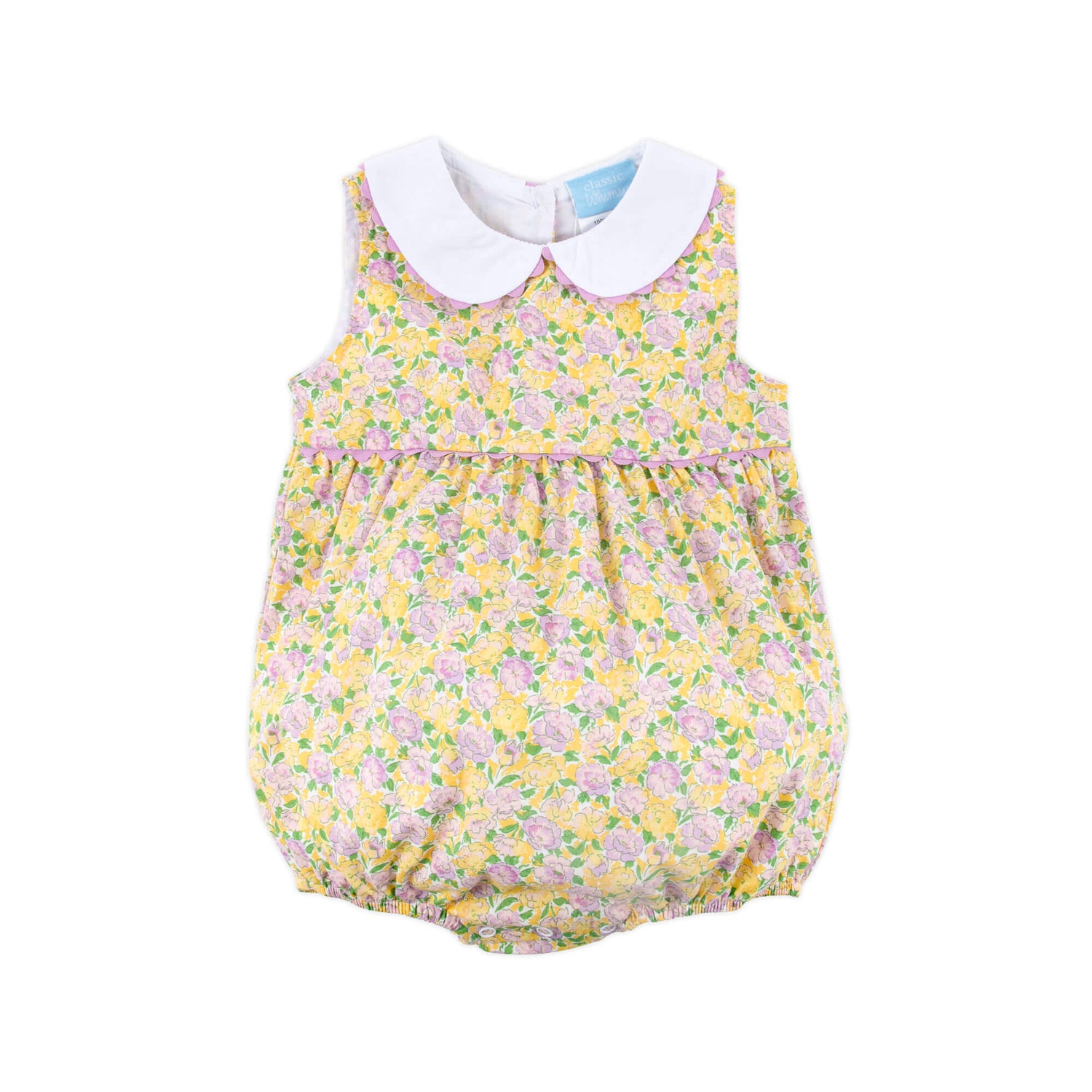 Flowers are blooming, and this beautiful Botanical Garden Heidi Bubble is perfect for the season. This Heidi style bubble features a yellow and pink floral print, a sleeveless design, and a cute collar with pink ric-rac trim. Snaps in stride for easy changes. Add a monogram to personalize the outfit and make it even more special.