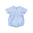 Your sweet little boy will look precious on his Christening Day, Easter or any special church events! Features hand-smocked white crosses on solid light blue pique fabric. Also features a cute Peter Pan collar with white piping. Snaps in stride and buttons in the back.