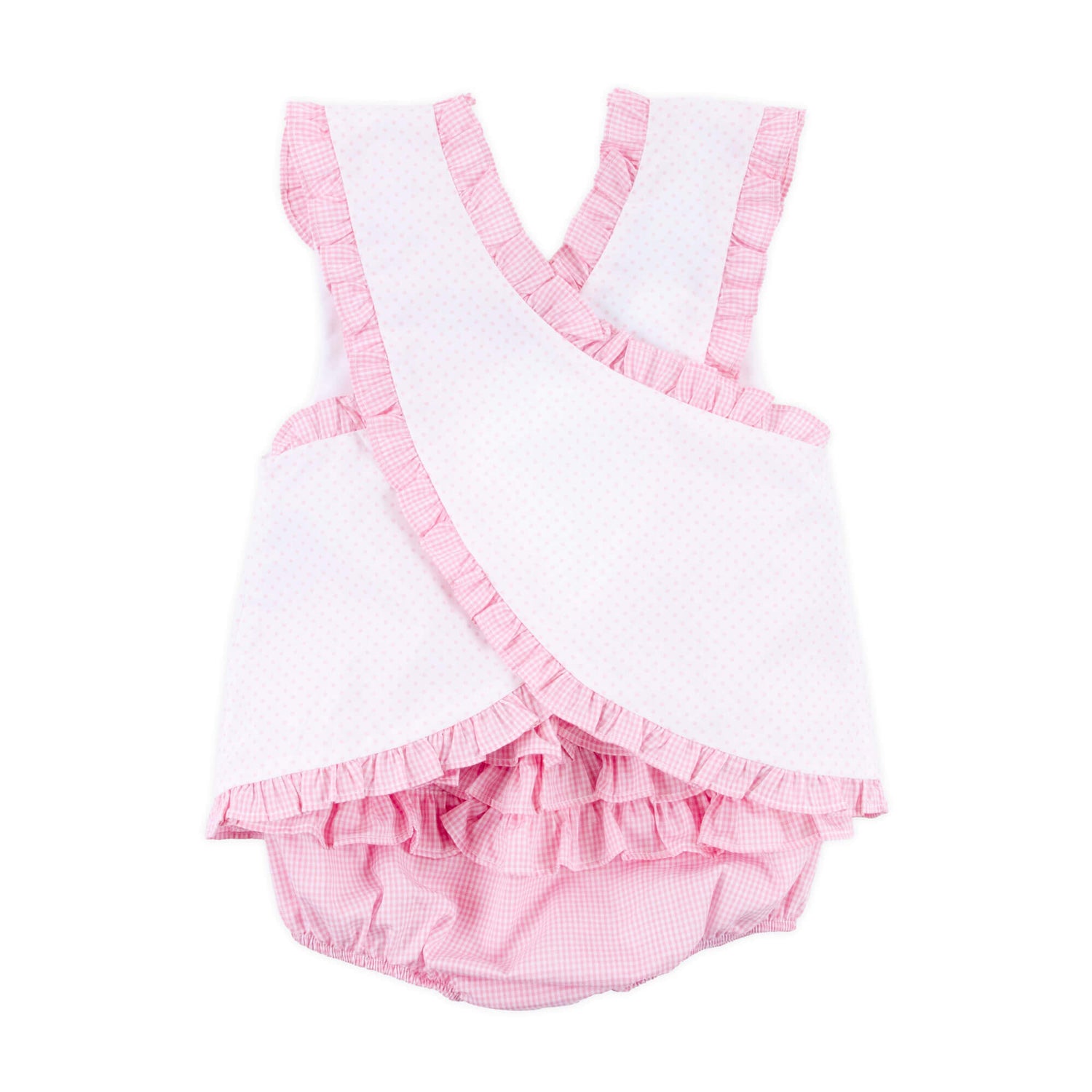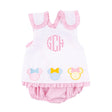 This Sweet Mouse Ears Popover Set is perfect for your little one this season. The pink polka dot top features three mouse ears appliqués, a cross back, and a ruffle hem, coordinating with pink gingham bloomers. Ideal for the trip of your dreams!