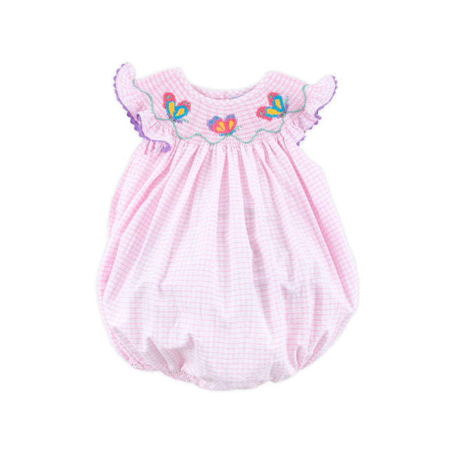 This Butterfly Magic Smocked Windowpane Angel Sleeve Bubble is a beautiful choice for spring days and special moments. Designed in a soft pink windowpane fabric, it features charming smocked butterflies and sweet angel flutter sleeves finished with purple ric rac trim for an extra touch of whimsy. Snaps in stride for easy changes.
