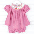 Your little one will adore this Farm Smocked Red Gingham Bloomer Set. The charming red gingham top features a smocked red barn and adorable animals like pigs, cows, horses, and roosters. Coordinated with red gingham bloomers, it's the perfect outfit for a farm-themed party or play date.