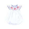 This Flag Smocked White Pique Bubble is ready to celebrate and honor the 4th of July in classic patriotic style. This white pique bubble features angel flutter sleeves with blue gingham tape trim and smocked flags for a sweet festive look. Snaps in stride for easy changes.