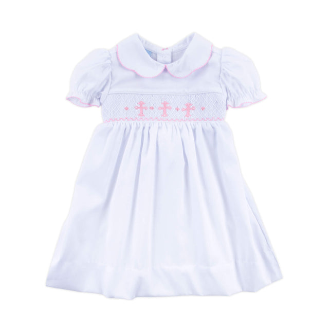 With this Pink Cross Smocked White Pique Collared Dress, your little angel will look absolutely stunning on her Christening Day or any special church event! This white piqué dress features hand-smocked pink crosses, a scalloped collar, bishop sleeves, and a sash tie for the sweetest finishing touch.