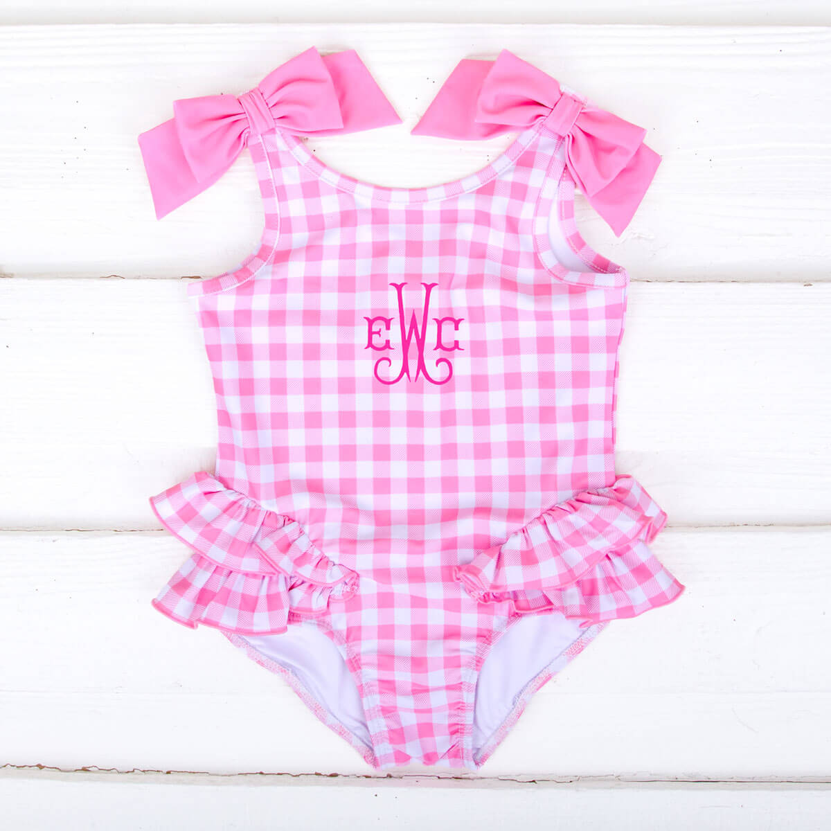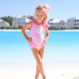 This Capri Pink One Piece Swimsuit is the perfect choice for your upcoming family vacation or poolside gathering. The one-piece swimsuit features a fabulous pink gingham print and ruffles on the side and the cutest bow shoulder detail. This swimsuit provides UPF 50 protection to keep your little one safe under the sun. Personalize the look by adding a monogram to make it uniquely yours!