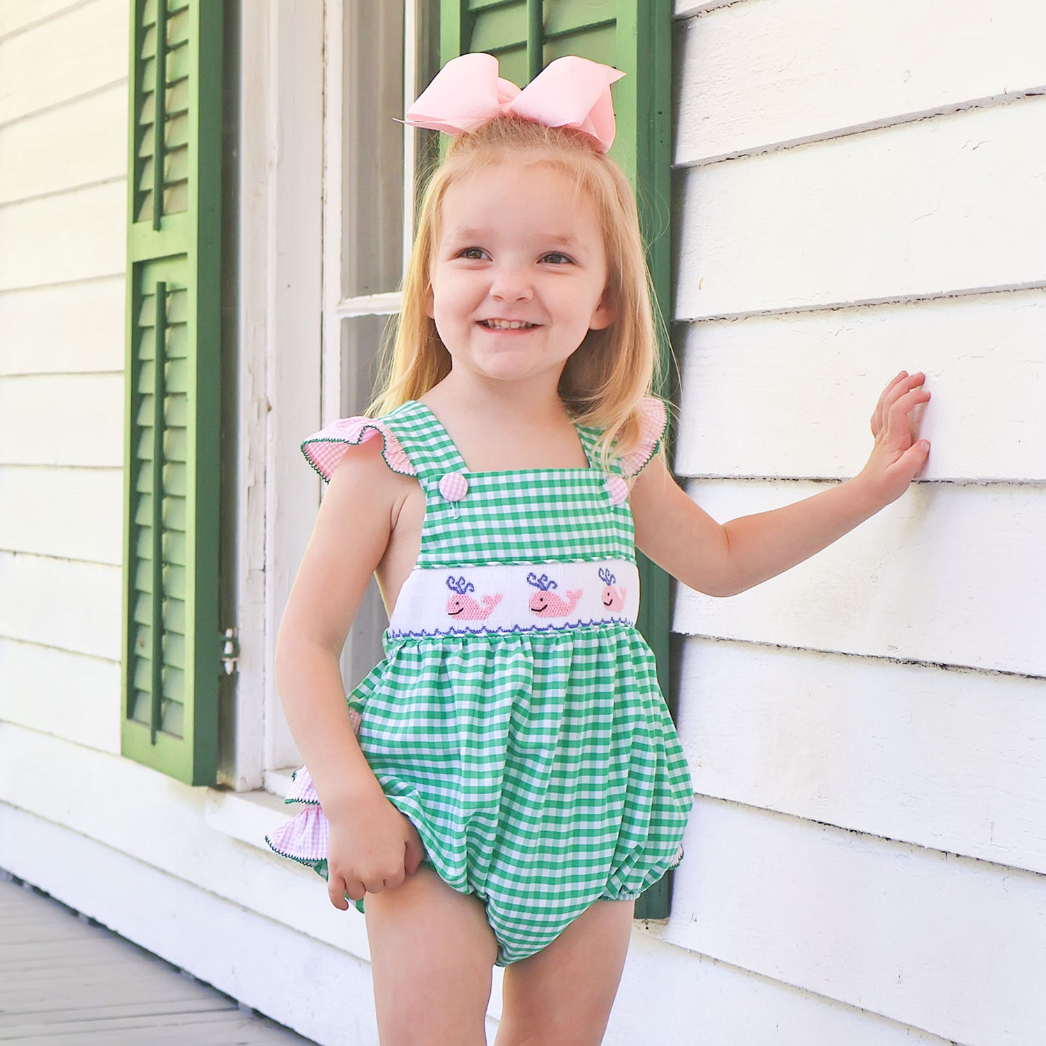 Whale Smocked Green Gingham Leah Bubble