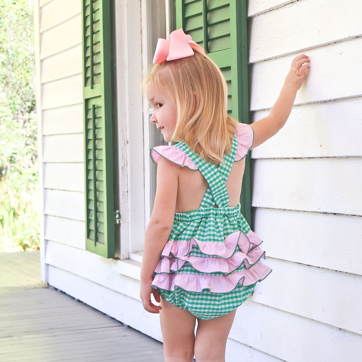 Our Whale Smocked Green Gingham Leah Bubble is the perfect choice for vacations and seaside adventures. Designed in classic green gingham, this charming bubble features cross-back straps, sweet pink gingham back ruffles, and hand-smocked whale detail for a timeless nautical look. Snaps at the stride allow for easy changes.
