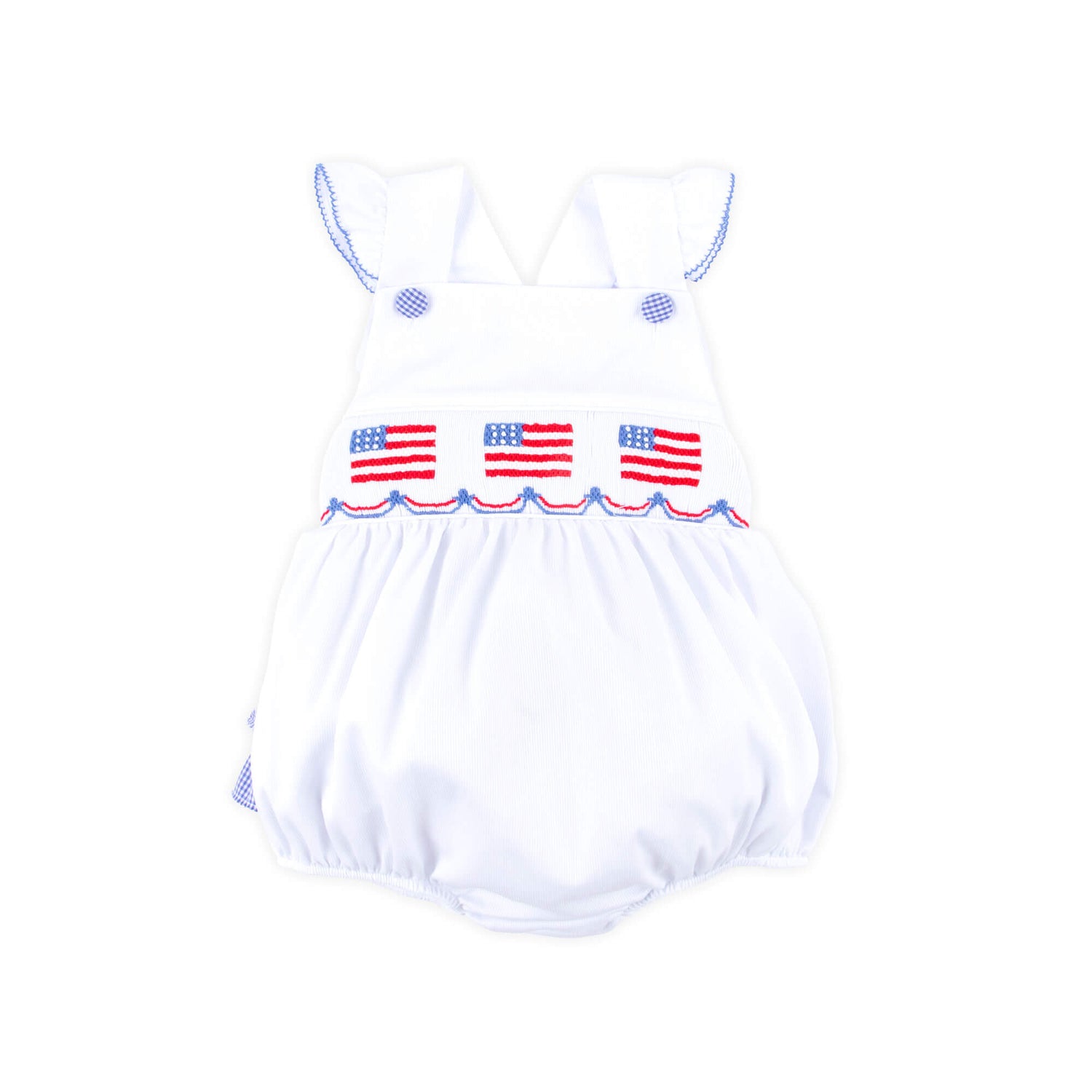 This Flag Smocked White Pique Leah Ruffle Bubble is ready to celebrate and honor the 4th of July in classic patriotic style. This white pique bubble features ruffled straps with cross-back detailing, smocked flags, and sweet royal gingham ruffles on the back for a festive look. Snaps in stride allow for easy changes.