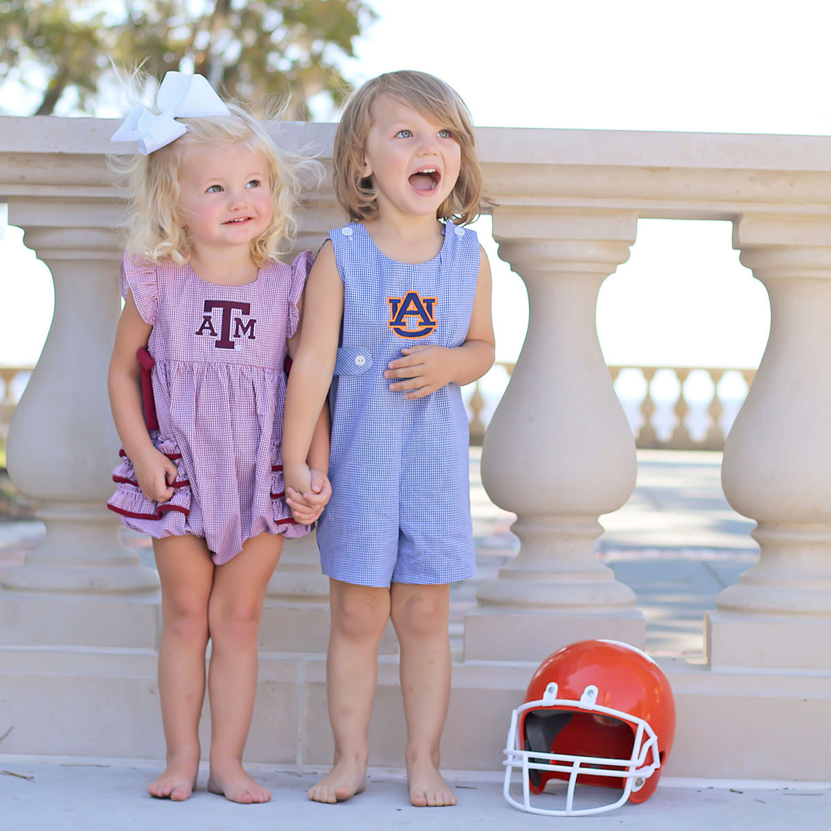 Go Tigers! Your little one will look adorable this football season in our Auburn Embroidered Navy Gingham Jon Jon. This cute outfit featuring Auburn embroidered logo on a navy gingham. Shoulder buttons and snaps in stride. Add a name monogram!