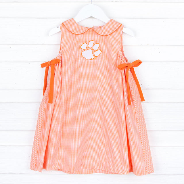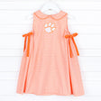 Go Tigers! Your little one will look adorable this football season in our Clemson Embroidered Orange Gingham Dress. This sleeveless orange gingham dress features a collar, Clemson embroidered logo, and sweet side-tie bows. Add a name monogram!