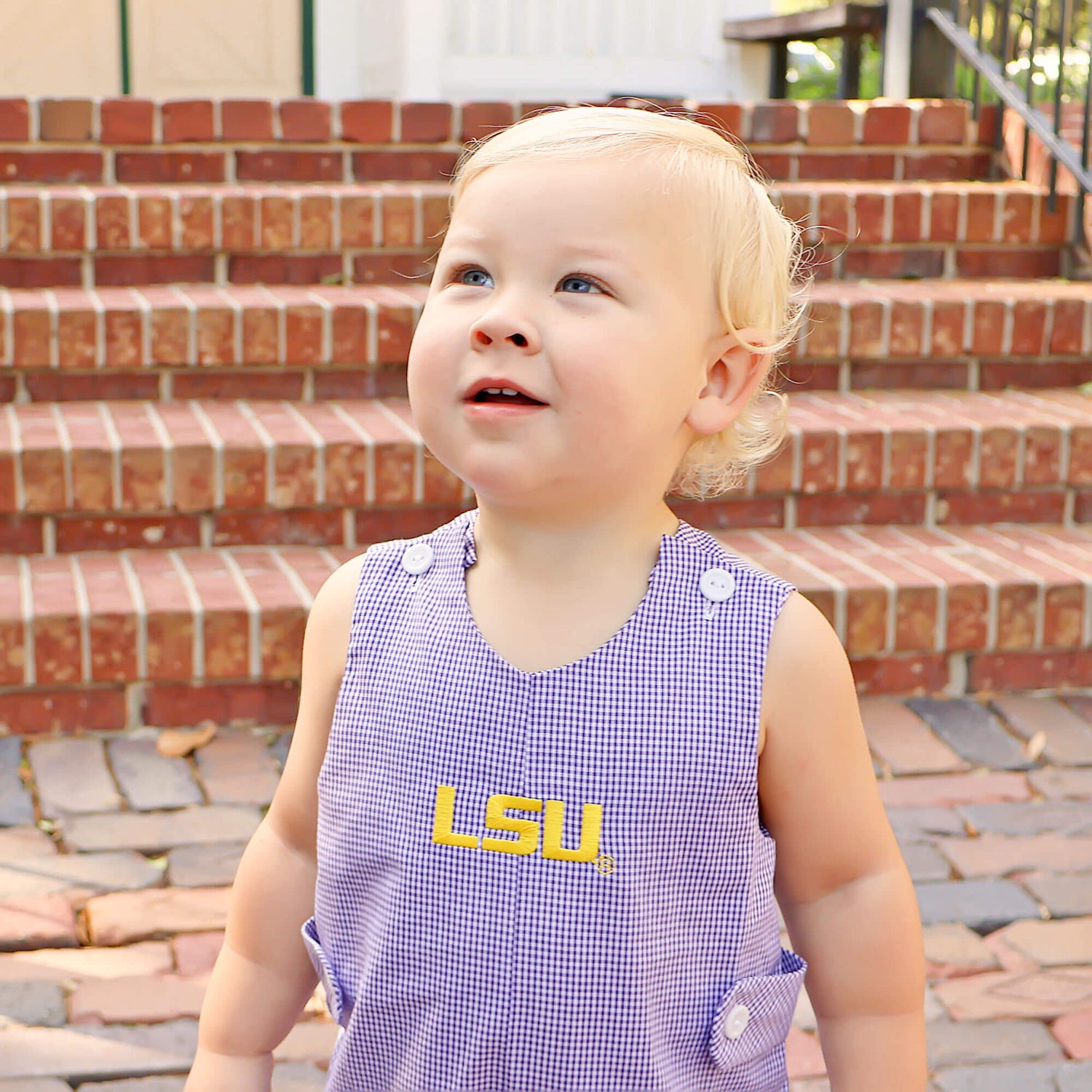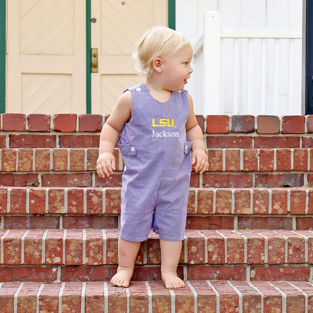 Go Tigers! Your little one will look adorable this football season in our LSU Embroidered Purple Gingham Jon Jon. This cute outfit featuring LSU embroidered logo on a purple gingham. Shoulder buttons and snaps in stride. Add a name monogram!