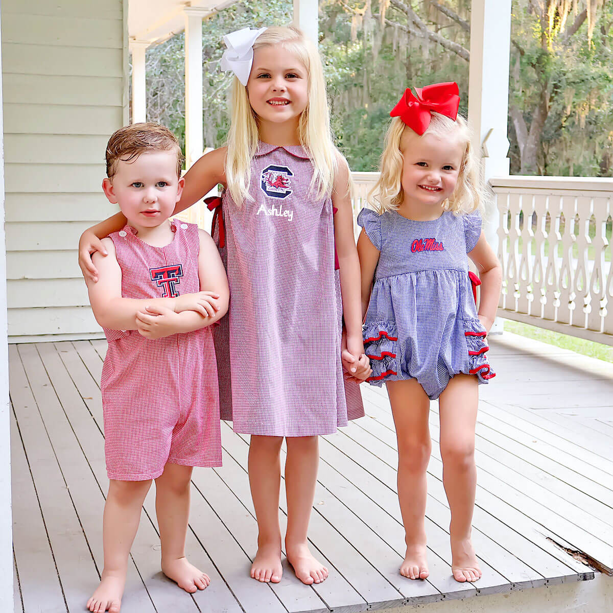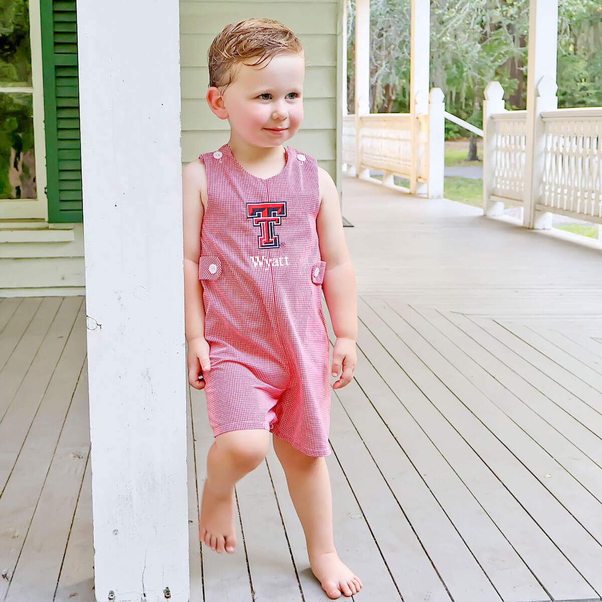 Go Raiders! Dress your little one in style this football season with our Texas Tech Embroidered Red Jon Jon. This charming gingham outfit proudly features the Texas Tech embroidered logo and includes side tabs for added detail. With convenient snaps in stride and back buttons for closure, it's as practical as it is cute! Personalize it with a name monogram for that extra special touch!