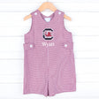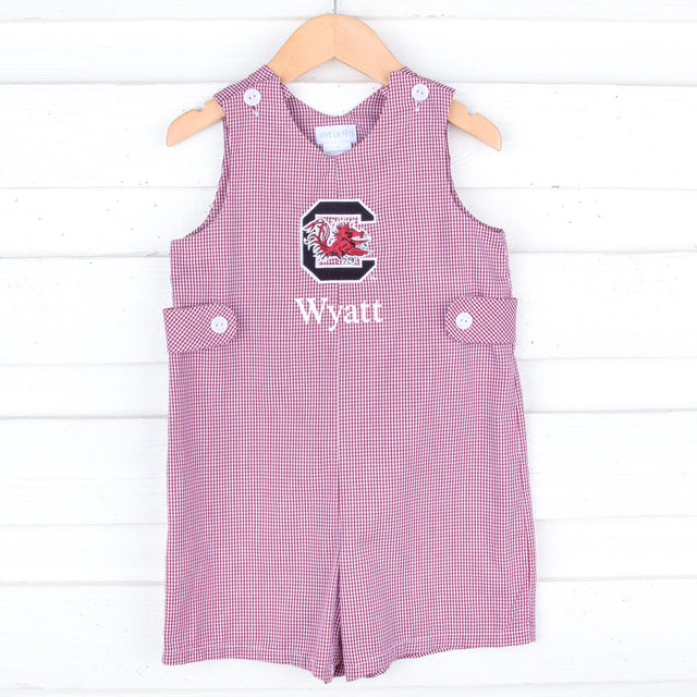 It's game time! Dress your little one in style this USC football season with our University of South Carolina Embroidered Maroon Jon Jon. This charming gingham outfit proudly features a Gamecocks embroidered logo and includes side tabs for added detail. With convenient snaps in stride and back buttons for closure, it's as practical as it is cute! Personalize it with a name monogram for that extra special touch!