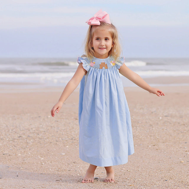 Let's build a sand castle! The Beach Baby Light Blue Smocked Angel Sleeve Dress is the ideal outfit for your upcoming beach vacation. This delightful mint dress features a smocked sandcastle scene and angel-style sleeves adorned with a pink picot trim.