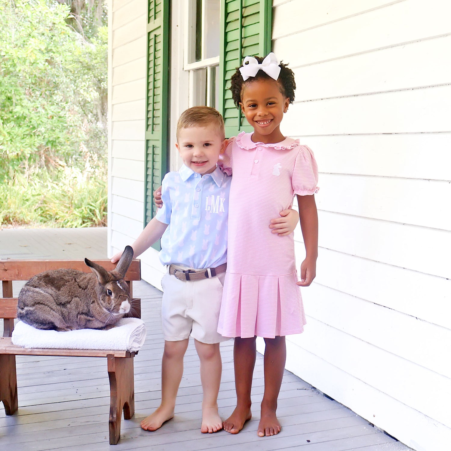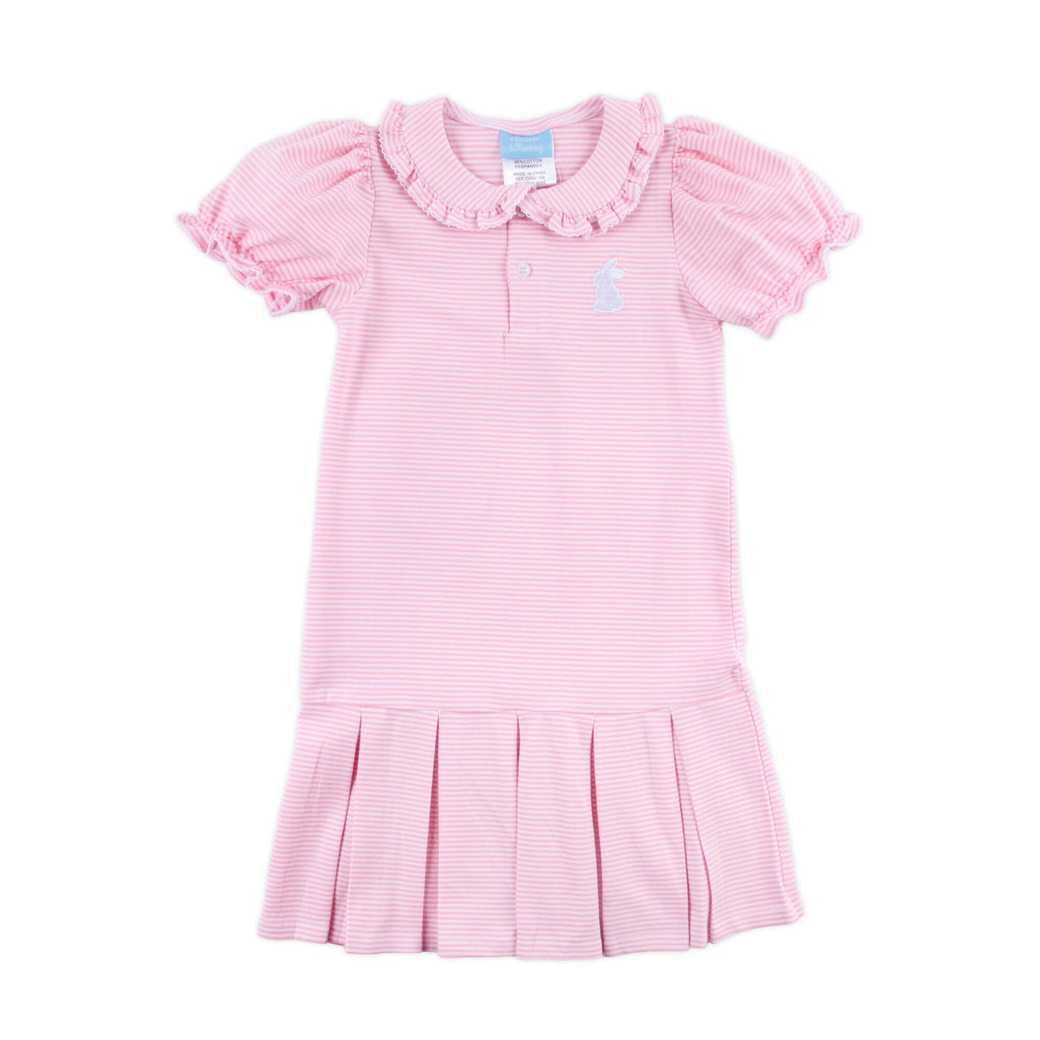 Get ready for Easter fun in our Bunny Pink Stripe Ruth Dress! This soft pleated knit dress features playful pink stripes, a sweet ruffle collar, bishop sleeves, and an embroidered bunny for an extra touch of charm. Add a monogram for a personalized finishing touch!