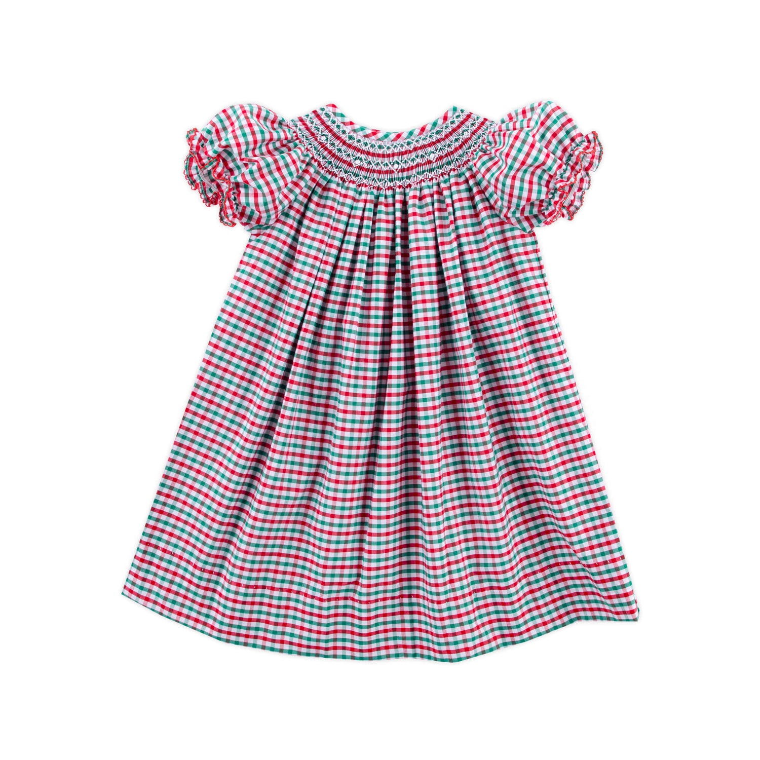 Celebrate Christmas in our Christmas Card Gingham Smocked Bishop Dress. This charming green gingham dress features elegant smocking, and bishop sleeves with red ric rac trim, making it perfect for the festive season. A timeless choice for your holiday celebrations!