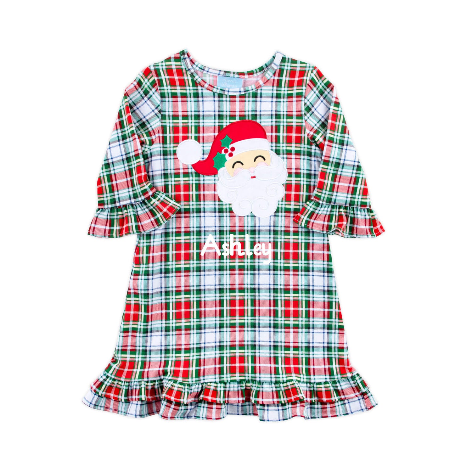 Get your little one into the holiday spirit with the Happy Santa Sinclair Plaid Milly Dress! This festive Sinclair knit plaid dress features charming 3/4 sleeves and a jolly Santa applique, making it perfect for spreading holiday cheer. Add a monogram for a personalized touch that makes this outfit even more special for the season!