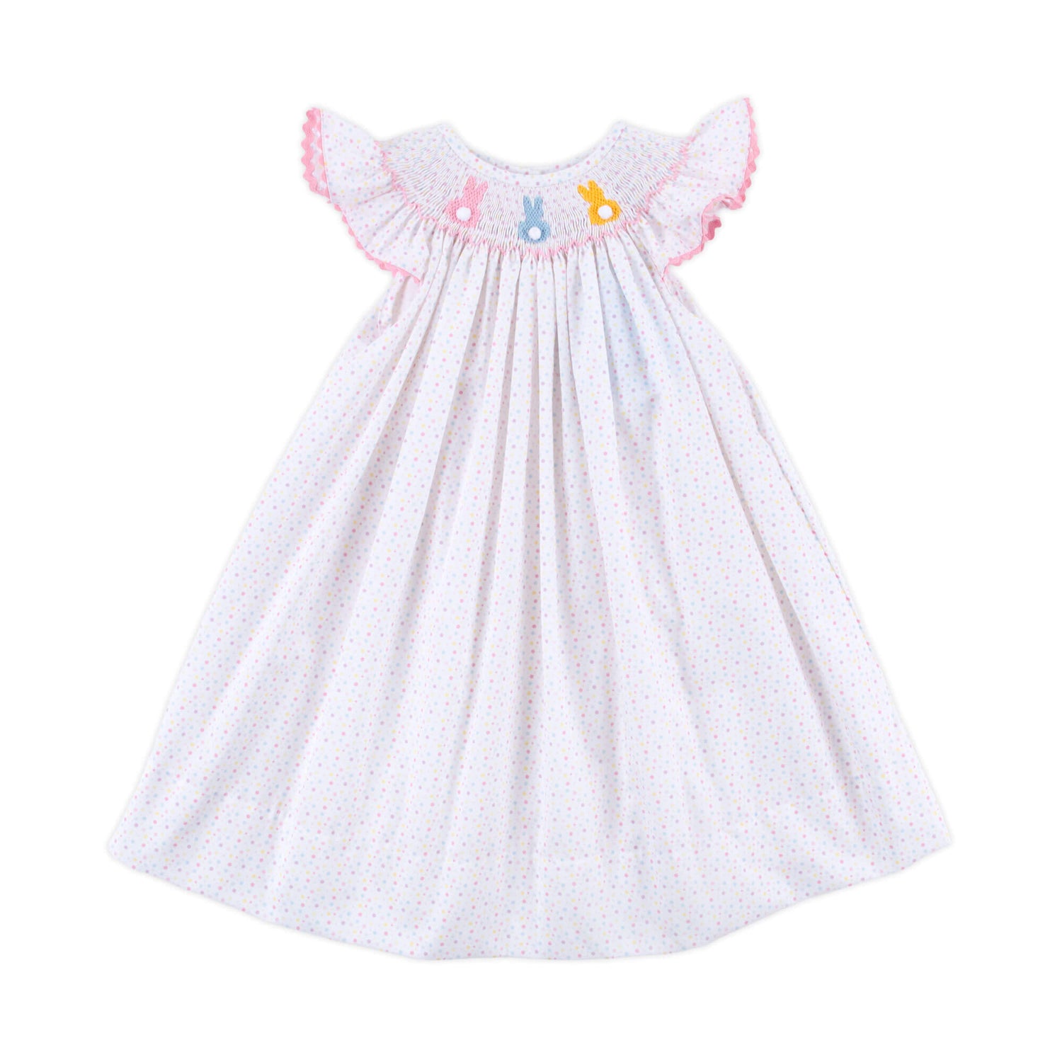 This Rainbow Peeps Smocked Polka Dot Angel Sleeve Dress is full of Easter fun! The dress features cheerful multi-color polka dots, fluttery angel sleeves trimmed with pink ric-rac, and the sweetest hand-smocked peeps with little white tails. Perfect for springtime celebrations!