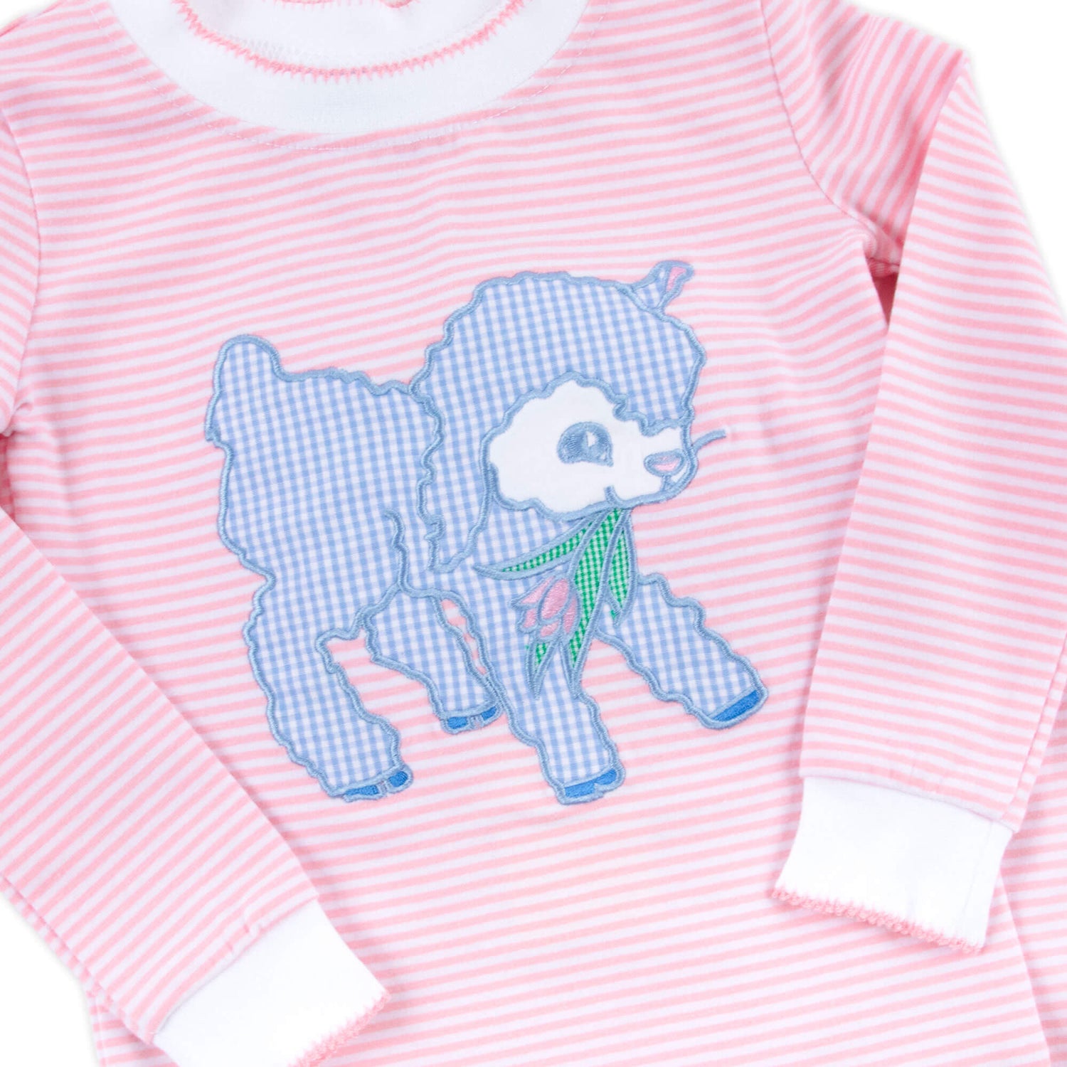 Get ready for nights filled with sweet bedtime stories in our Baby Lamb Pink Stripe Pajamas! This darling set features a soft pink stripe knit long-sleeve pajama top adorned with an adorable baby lamb appliqué, making Easter bedtime feel extra special. Paired with matching pink stripe pull-on pajama pants, it’s perfect for storytime snuggles and delightful dreams. Add a monogram for a personalized touch your little one will love!